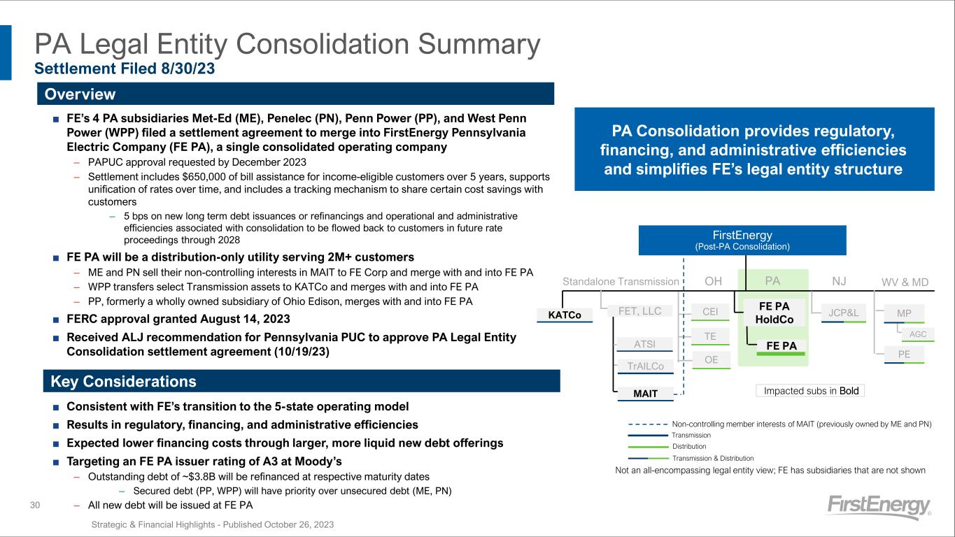 TrAILCo PA Legal Entity Consolidation Summary Settlement Filed 8/30/23 ■ FE’s 4 PA subsidiaries Met-Ed (ME), Penelec (PN), Penn Power (PP), and West Penn Power (WPP) filed a settlement agreement to merge into FirstEnergy Pennsylvania Electric Company (FE PA), a single consolidated operating company – PAPUC approval requested by December 2023 – Settlement includes $650,000 of bill assistance for income-eligible customers over 5 years, supports unification of rates over time, and includes a tracking mechanism to share certain cost savings with customers – 5 bps on new long term debt issuances or refinancings and operational and administrative efficiencies associated with consolidation to be flowed back to customers in future rate proceedings through 2028 ■ FE PA will be a distribution-only utility serving 2M+ customers – ME and PN sell their non-controlling interests in MAIT to FE Corp and merge with and into FE PA – WPP transfers select Transmission assets to KATCo and merges with and into FE PA – PP, formerly a wholly owned subsidiary of Ohio Edison, merges with and into FE PA ■ FERC approval granted August 14, 2023 ■ Received ALJ recommendation for Pennsylvania PUC to approve PA Legal Entity Consolidation settlement agreement (10/19/23) ■ Consistent with FE’s transition to the 5-state operating model ■ Results in regulatory, financing, and administrative efficiencies ■ Expected lower financing costs through larger, more liquid new debt offerings ■ Targeting an FE PA issuer rating of A3 at Moody’s – Outstanding debt of ~$3.8B will be refinanced at respective maturity dates – Secured debt (PP, WPP) will have priority over unsecured debt (ME, PN) – All new debt will be issued at FE PA CEI TE FE PA HoldCo ATSI FET, LLC OE OH PAStandalone Transmission KATCo MAIT Non-controlling member interests of MAIT (previously owned by ME and PN) Not an all-encompassing legal entity view; FE has subsidiaries that are not shown FE PA NJ JCP&L AGC WV & MD MP PE Overview Impacted subs in Bold FirstEnergy (Post-PA Consolidation) PA Consolidation provides regulatory, financing, and administrative efficiencies and simplifies FE’s legal entity structure Distribution Transmission Transmission & Distribution Strategic & Financial Highlights - Published October 26, 2023 30 Key Considerations