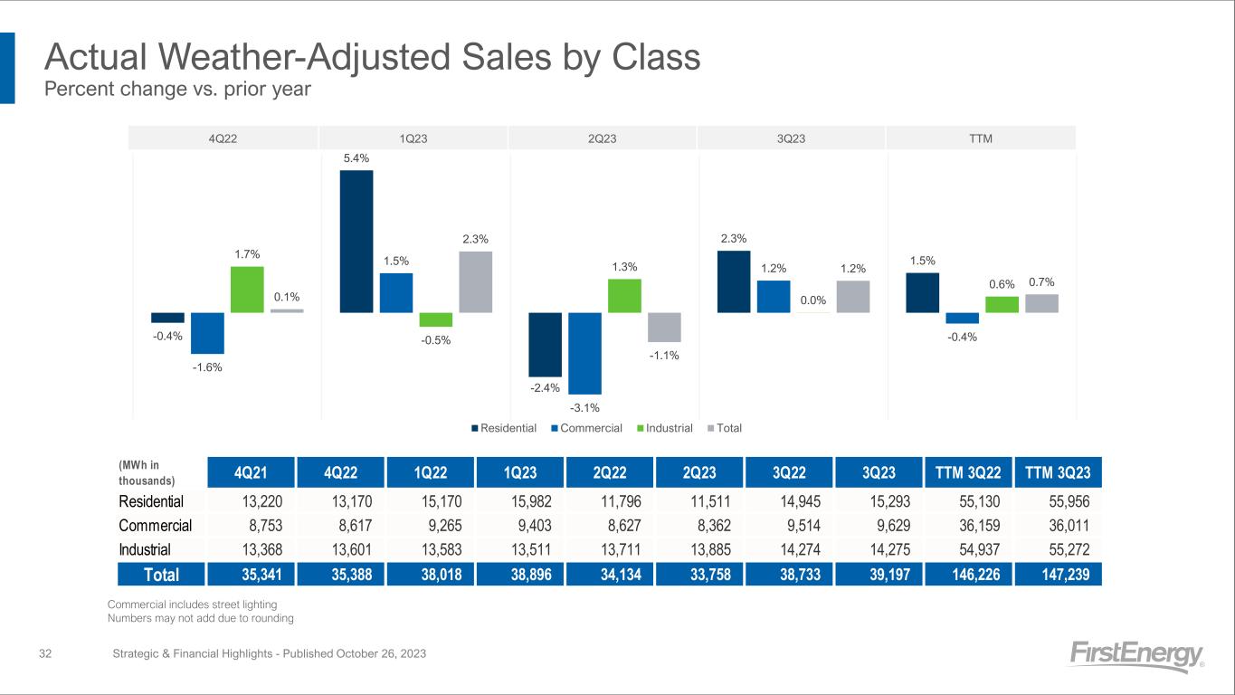 Actual Sales by Class Percent change vs. prior year 31 3.1% -8.4% -10.8% -3.5% -4.9% 0.6% -7.1% -6.4% -1.2% -3.5% 1.7% -0.5% 1.3% 0.0% 0.6% 2.0% -5.3% -4.9% -1.7% -2.5% 4Q22 1Q23 2Q23 3Q23 TTM Residential Commercial Industrial Total Commercial includes street lighting Numbers may not add due to rounding Strategic & Financial Highlights - Published October 26, 2023 (MWh in thousands) 4Q21 4Q22 1Q22 1Q23 2Q22 2Q23 3Q22 3Q23 TTM 3Q22 TTM 3Q23 Residential 12,735 13,135 15,213 13,941 12,146 10,835 15,500 14,955 55,594 52,866 Commercial 8,594 8,649 9,291 8,632 8,715 8,161 9,662 9,541 36,263 34,983 Industrial 13,368 13,601 13,583 13,511 13,711 13,885 14,274 14,275 54,937 55,272 Total 34,697 35,385 38,087 36,084 34,573 32,881 39,436 38,771 146,793 143,121