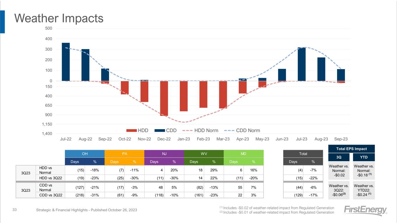 Weather Impacts Strategic & Financial Highlights - Published October 26, 2023 0 100 200 300 400 500 1,400 1,150 900 650 400 150 Jul-22 Aug-22 Sep-22 Oct-22 Nov-22 Dec-22 Jan-23 Feb-23 Mar-23 Apr-23 May-23 Jun-23 Jul-23 Aug-23 Sep-23 HDD CDD HDD Norm CDD Norm 33 Total EPS Impact 3Q YTD Weather vs. Normal: -$0.02 Weather vs. Normal: -$0.18 (1) Weather vs. 3Q22: -$0.06(2) Weather vs. YTD22: -$0.24 (1) (1) Includes -$0.02 of weather-related impact from Regulated Generation (2) Includes -$0.01 of weather-related impact from Regulated Generation Days % Days % Days % Days % Days % Days % HDD vs Normal (15) -18% (7) -11% 4 20% 18 29% 6 16% (4) -7% HDD vs 3Q22 (19) -23% (25) -30% (11) -30% 14 22% (11) -20% (15) -22% CDD vs Normal (127) -21% (17) -3% 48 5% (82) -13% 55 7% (44) -6% CDD vs 3Q22 (218) -31% (61) -9% (118) -10% (161) -23% 22 3% (129) -17% Total 3Q23 OH PA NJ WV MD 3Q23