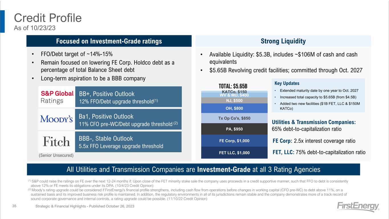 • On February 10, 2023, S&P changed the outlook of FE and most subsidiaries to Positive • On September 13, 2022, Moody’s issued one-notch downgrades for CEI and TE and changed their outlook to Stable • On July 22, 2022, Fitch issued one-notch upgrades on FE, FET, and all subsidiaries. • All companies are now investment grade with a Stable outlook Credit Ratings As of 10/23/23 Strategic & Financial Highlights - Published October 26, 2023 Most Recent Ratings Actions 34 S&P Moody's Fitch S&P Moody's Fitch S&P Moody's Fitch S&P Moody's Fitch FirstEnergy Corp.(*) BBB- Ba1 BBB- BB+ Ba1 BBB- P P S Allegheny Generating Co. BB+ Baa2 BBB P S S American Transmission Systems Inc. BBB A3 BBB BBB A3 BBB+ P S S Cleveland Electric Illuminating BBB Baa3 BBB A- Baa1 A- BBB Baa3 BBB+ P S S FirstEnergy Transmission(*) BBB- Baa2 BBB- BB+ Baa2 BBB- P S S Jersey Central Power & Light BBB A3 BBB BBB A3 BBB+ P S S Metropolitan Edison BBB A3 BBB BBB A3 BBB+ P S S Mid-Atlantic Interstate Transmission BBB A3 BBB BBB A3 BBB+ P S S Monongahela Power BBB Baa2 BBB A- A3 A- BBB Baa2 S S S Ohio Edison BBB A3 BBB A- A1 A- BBB A3 BBB+ P S S Pennsylvania Electric BBB Baa1 BBB BBB Baa1 BBB+ P S S Pennsylvania Power BBB A3 BBB A- A1 P S S Potomac Edison BBB Baa2 BBB A- A3 A- S S S Toledo Edison BBB Baa2 BBB A- A3 A- P S S Trans-Allegheny Interstate Line Co. BBB A3 BBB BBB A3 BBB+ P S S West Penn Power BBB A3 BBB A- A1 A- P S S (*) = holding company S = Stable Shaded cells reflect non-investment grade ratings P = Positive N = Negative Ratings are not recommendations to buy, sell, or hold securities. Ratings are subject to change or withdrawal at any time by the credit rating agencies. Issuer/Corporate Family Senior Secured Senior Unsecured Outlook/Watch