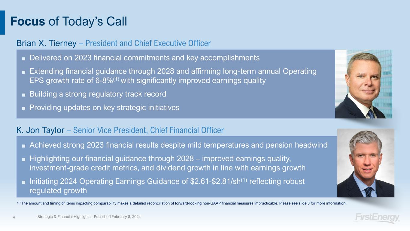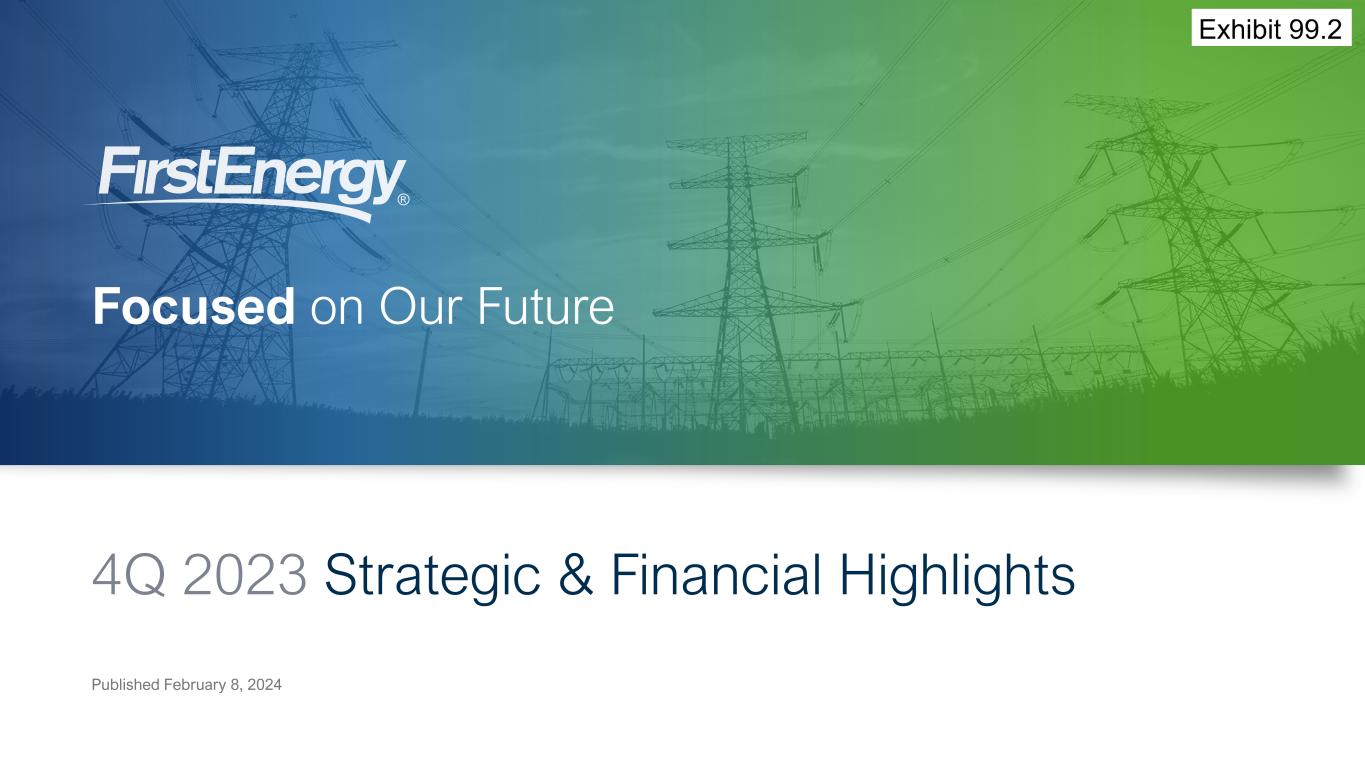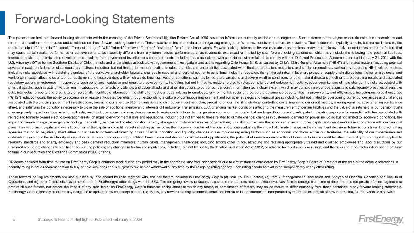 Non-GAAP Financial Matters 1 Strategic & Financial Highlights - Published February 8, 2024 This presentation contains references to certain financial measures including, Operating earnings (loss) and Operating earnings (loss) per share (“EPS”), including by segment, and the impact of special items on the following measures, Total revenues, Total operating expenses, Total other expense, and Earnings (loss) attributable to FirstEnergy Corp. from continuing operations as “non-GAAP financial measures” which are not calculated in accordance with U.S. Generally Accepted Accounting Principals, (“GAAP”). Management uses these non-GAAP financial measures to evaluate the Company’s and its segments’ performance and manage its operations and frequently references these non-GAAP financial measures in its decision-making, using them to facilitate historical and ongoing performance comparisons. Management believes that the non-GAAP financial measures of Operating earnings (loss) and Operating EPS, including by segment, provide consistent and comparable measures of performance of its businesses on an ongoing basis. Management also believes that such measures are useful to shareholders and other interested parties to understand performance trends and evaluate the Company against its peer group by presenting period-over-period operating results without the effect of certain special items that may not be consistent or comparable across periods or across the Company’s peer group. These non-GAAP financial measures are intended to complement, and are not considered as alternatives to, the most directly comparable GAAP financial measures, which for Operating EPS is Continuing Operations EPS (GAAP), as reconciled in the above table. Also, the non-GAAP financial measures may not be comparable to similarly titled measures used by other entities. Special items represent charges incurred or benefits realized that management believes are not indicative of, or may obscure trends useful in evaluating the Company’s ongoing core activities and results of operations or otherwise warrant separate classification. Operating EPS is calculated by dividing Operating earnings (loss), which excludes special items as discussed above, for the periods presented by the weighted average number of common shares outstanding, which is 572 million shares for the fourth quarter of 2022, 571 million shares for full year 2022, 574 million shares for the fourth quarter of 2023, 573 million shares for the full year 2023, 575 million shares in the first quarter of 2024 and 576 million shares for the full year 2024. A reconciliation of forward-looking non-GAAP measures, including 2024 Operating EPS and long-term annual Operating EPS growth projections, to the most directly comparable GAAP measures is not provided because comparable GAAP measures for such measures are not reasonably accessible or reliable due to the inherent difficulty in forecasting and quantifying measures that would be necessary for such reconciliation. Specifically, management cannot, without reasonable effort, predict the impact of these special items in the context of operating EPS guidance and long-term annual operating EPS growth rate projections because these items, which could be significant, are difficult to predict and may be highly variable. In addition, the company believes such a reconciliation would imply a degree of precision and certainty that could be confusing to investors. These items are uncertain, depend on various factors and may have a material impact on our future GAAP results.