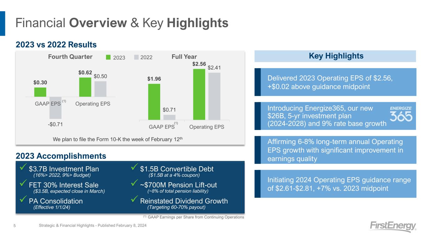 Focus of Today’s Call ■ Delivered on 2023 financial commitments and key accomplishments ■ Extending financial guidance through 2028 and affirming long-term annual Operating EPS growth rate of 6-8%(1) with significantly improved earnings quality ■ Building a strong regulatory track record ■ Providing updates on key strategic initiatives 4 Strategic & Financial Highlights - Published February 8, 2024 ■ Achieved strong 2023 financial results despite mild temperatures and pension headwind ■ Highlighting our financial guidance through 2028 – improved earnings quality, investment-grade credit metrics, and dividend growth in line with earnings growth ■ Initiating 2024 Operating Earnings Guidance of $2.61-$2.81/sh(1) reflecting robust regulated growth Brian X. Tierney – President and Chief Executive Officer K. Jon Taylor – Senior Vice President, Chief Financial Officer (1) The amount and timing of items impacting comparability makes a detailed reconciliation of forward-looking non-GAAP financial measures impracticable. Please see slide 3 for more information.