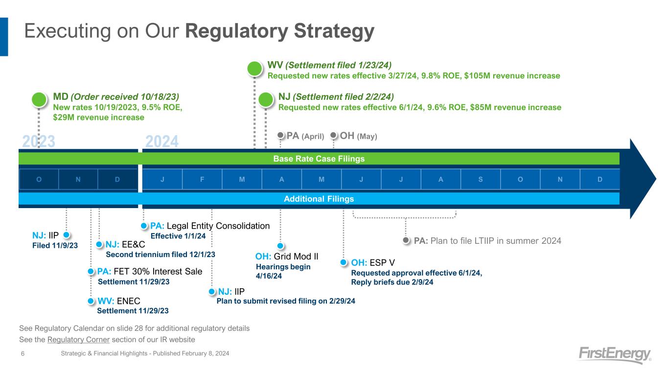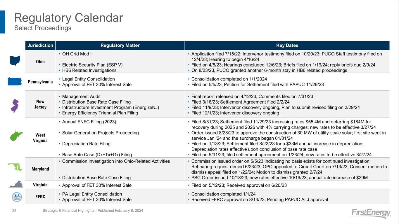 Jurisdiction Regulatory Matter Key Dates Ohio • OH Grid Mod II • Electric Security Plan (ESP V) • HB6 Related Investigations • Application filed 7/15/22; Intervenor testimony filed on 10/20/23; PUCO Staff testimony filed on 12/4/23; Hearing to begin 4/16/24 • Filed on 4/5/23; Hearings concluded 12/6/23; Briefs filed on 1/19/24; reply briefs due 2/9/24 • On 8/23/23, PUCO granted another 6-month stay in HB6 related proceedings Pennsylvania • Legal Entity Consolidation • Approval of FET 30% Interest Sale • Consolidation completed on 1/1/2024 • Filed on 5/5/23; Petition for Settlement filed with PAPUC 11/29/23 New Jersey • Management Audit • Distribution Base Rate Case Filing • Infrastructure Investment Program (EnergizeNJ) • Energy Efficiency Triennial Plan Filing • Final report released on 4/12/23; Comments filed on 7/31/23 • Filed 3/16/23; Settlement Agreement filed 2/2/24 • Filed 11/9/23; Intervenor discovery ongoing, Plan to submit revised filing on 2/29/24 • Filed 12/1/23; Intervenor discovery ongoing West Virginia • Annual ENEC Filing (2023) • Solar Generation Projects Proceeding • Depreciation Rate Filing • Base Rate Case (Dx+Tx+Gx) Filing • Filed 8/31/23; Settlement filed 11/29/23 increasing rates $55.4M and deferring $184M for recovery during 2025 and 2026 with 4% carrying charges; new rates to be effective 3/27/24 • Order issued 8/23/23 to approve the construction of 30 MW of utility-scale solar; first site went in service Jan ‘24 and the surcharge began 01/01/24 • Filed on 1/13/23; Settlement filed 8/22/23 for a $33M annual increase in depreciation; Depreciation rates effective upon conclusion of base rate case • Filed on 5/31/23; filed settlement agreement on 1/23/24; new rates to be effective 3/27/24 Maryland • Commission Investigation into Ohio-Related Activities • Distribution Base Rate Case Filing • Commission issued order on 5/5/23 indicating no basis exists for continued investigation; Rehearing request denied 6/23/23; OPC appealed to Circuit Court on 7/13/23; Consent motion to dismiss appeal filed on 1/22/24; Motion to dismiss granted 2/7/24 • PSC Order issued 10/18/23, new rates effective 10/19/23, annual rate increase of $29M Virginia • Approval of FET 30% Interest Sale • Filed on 5/12/23; Received approval on 6/20/23 FERC • PA Legal Entity Consolidation • Approval of FET 30% Interest Sale • Consolidation completed 1/1/24 • Received FERC approval on 8/14/23; Pending PAPUC ALJ approval Regulatory Calendar Select Proceedings Strategic & Financial Highlights - Published February 8, 202428