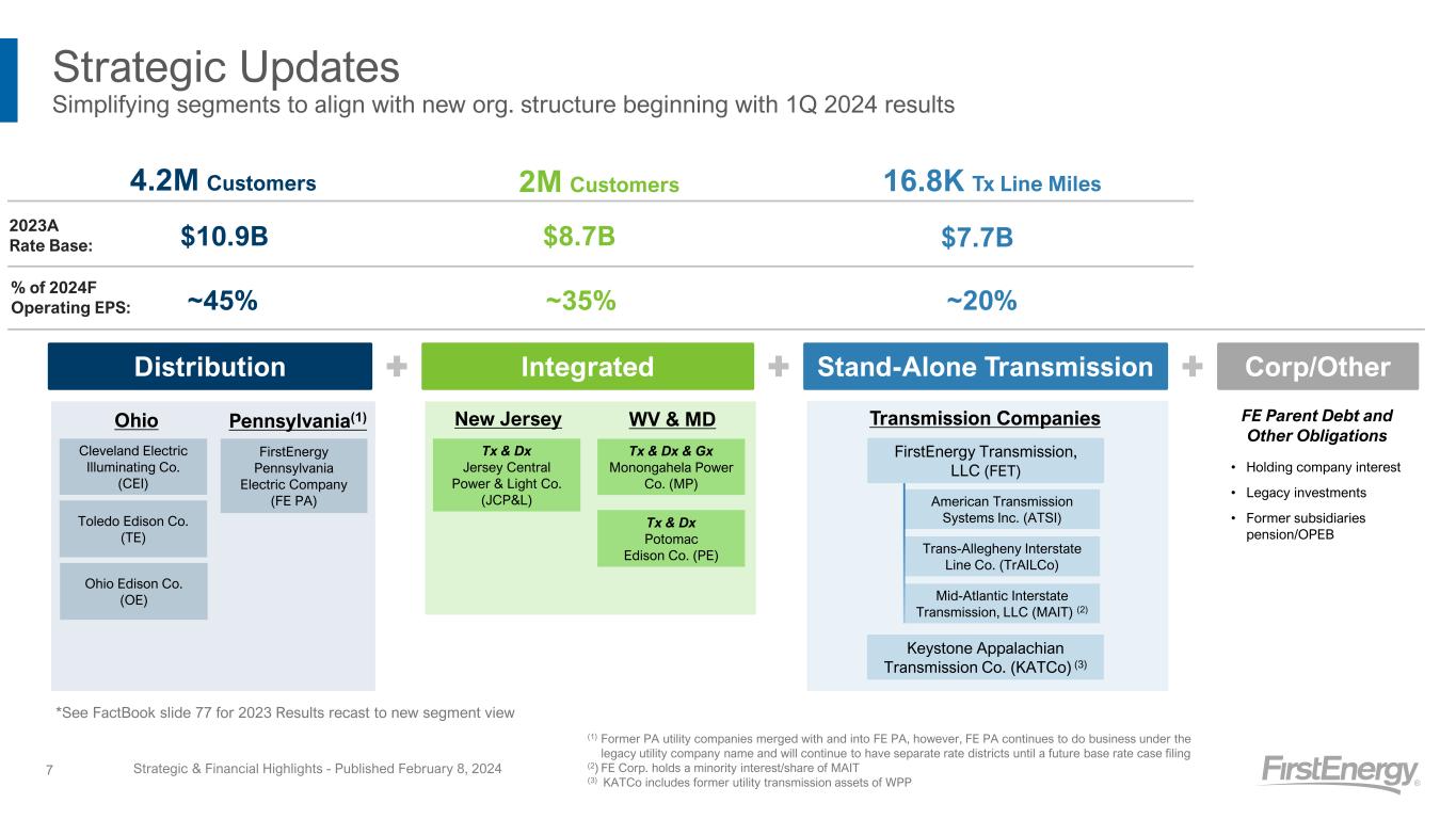 2023 2024 Strategic & Financial Highlights - Published February 8, 20246 Executing on Our Regulatory Strategy WV (Settlement filed 1/23/24) Requested new rates effective 3/27/24, 9.8% ROE, $105M revenue increase O N D Base Rate Case Filings Additional Filings J F M A M J J A S O N D PA (April) OH (May) PA: Plan to file LTIIP in summer 2024 See Regulatory Calendar on slide 28 for additional regulatory details See the Regulatory Corner section of our IR website OH: Grid Mod II Hearings begin 4/16/24 OH: ESP V Requested approval effective 6/1/24, Reply briefs due 2/9/24 Effective 1/1/24 PA: FET 30% Interest Sale Settlement 11/29/23 NJ (Settlement filed 2/2/24) Requested new rates effective 6/1/24, 9.6% ROE, $85M revenue increase NJ: IIP Filed 11/9/23 Second triennium filed 12/1/23 WV: ENEC Settlement 11/29/23 MD (Order received 10/18/23) New rates 10/19/2023, 9.5% ROE, $29M revenue increase PA: Legal Entity Consolidation NJ: IIP Plan to submit revised filing on 2/29/24 NJ: EE&C
