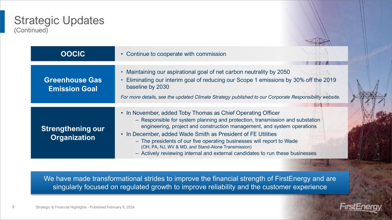 Strategic Updates Simplifying segments to align with new org. structure beginning with 1Q 2024 results Strategic & Financial Highlights - Published February 8, 20247 4.2M Customers *See FactBook slide 77 for 2023 Results recast to new segment view (1) Former PA utility companies merged with and into FE PA, however, FE PA continues to do business under the legacy utility company name and will continue to have separate rate districts until a future base rate case filing (2) FE Corp. holds a minority interest/share of MAIT (3) KATCo includes former utility transmission assets of WPP Cleveland Electric Illuminating Co. (CEI) Toledo Edison Co. (TE) FirstEnergy Pennsylvania Electric Company (FE PA) American Transmission Systems Inc. (ATSI) Mid-Atlantic Interstate Transmission, LLC (MAIT) (2) Trans-Allegheny Interstate Line Co. (TrAILCo) FirstEnergy Transmission, LLC (FET) Ohio Edison Co. (OE) Tx & Dx & Gx Monongahela Power Co. (MP) Tx & Dx Potomac Edison Co. (PE) Tx & Dx Jersey Central Power & Light Co. (JCP&L) Keystone Appalachian Transmission Co. (KATCo) (3) FE Parent Debt and Other Obligations • Holding company interest • Legacy investments • Former subsidiaries pension/OPEB Ohio Pennsylvania(1) New Jersey WV & MD Transmission Companies Stand-Alone Transmission Distribution Integrated Corp/Other % of 2024F Operating EPS: ~45% ~35% ~20% 2023A Rate Base: $10.9B $8.7B $7.7B 2M Customers 16.8K Tx Line Miles