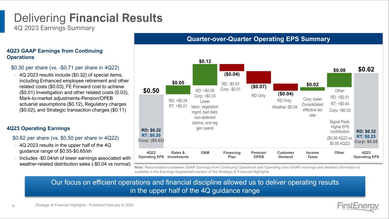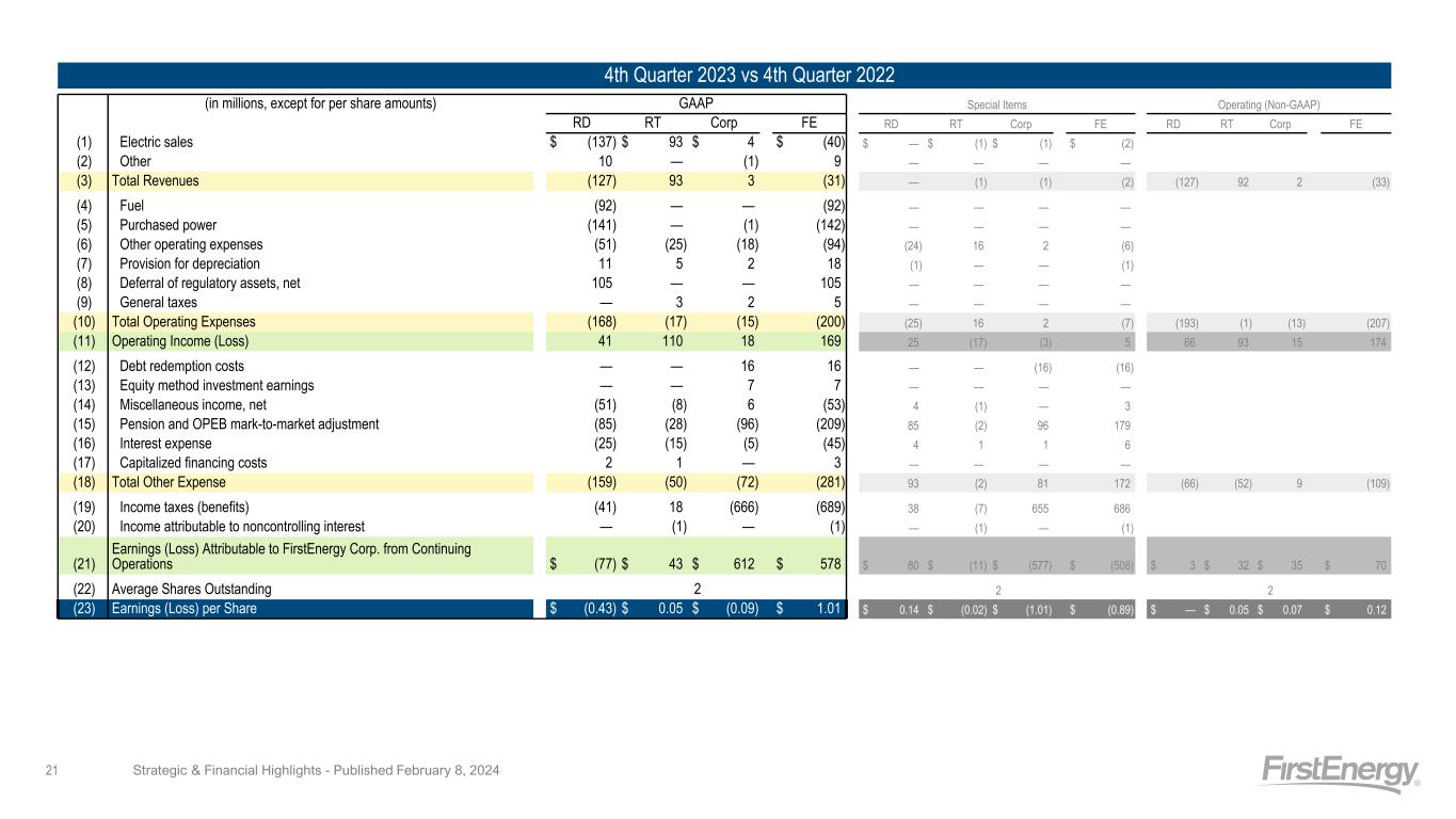 4th Quarter 2023 vs 4th Quarter 2022 (in millions, except for per share amounts) GAAP Special Items Operating (Non-GAAP) RD RT Corp FE RD RT Corp FE RD RT Corp FE (1) Electric sales $ (137) $ 93 $ 4 $ (40) $ — $ (1) $ (1) $ (2) (2) Other 10 — (1) 9 — — — — (3) Total Revenues (127) 93 3 (31) — (1) (1) (2) (127) 92 2 (33) (4) Fuel (92) — — (92) — — — — (5) Purchased power (141) — (1) (142) — — — — (6) Other operating expenses (51) (25) (18) (94) (24) 16 2 (6) (7) Provision for depreciation 11 5 2 18 (1) — — (1) (8) Deferral of regulatory assets, net 105 — — 105 — — — — (9) General taxes — 3 2 5 — — — — (10) Total Operating Expenses (168) (17) (15) (200) (25) 16 2 (7) (193) (1) (13) (207) (11) Operating Income (Loss) 41 110 18 169 25 (17) (3) 5 66 93 15 174 (12) Debt redemption costs — — 16 16 — — (16) (16) (13) Equity method investment earnings — — 7 7 — — — — (14) Miscellaneous income, net (51) (8) 6 (53) 4 (1) — 3 (15) Pension and OPEB mark-to-market adjustment (85) (28) (96) (209) 85 (2) 96 179 (16) Interest expense (25) (15) (5) (45) 4 1 1 6 (17) Capitalized financing costs 2 1 — 3 — — — — (18) Total Other Expense (159) (50) (72) (281) 93 (2) 81 172 (66) (52) 9 (109) (19) Income taxes (benefits) (41) 18 (666) (689) 38 (7) 655 686 (20) Income attributable to noncontrolling interest — (1) — (1) — (1) — (1) (21) Earnings (Loss) Attributable to FirstEnergy Corp. from Continuing Operations $ (77) $ 43 $ 612 $ 578 $ 80 $ (11) $ (577) $ (508) $ 3 $ 32 $ 35 $ 70 (22) Average Shares Outstanding 2 2 2 (23) Earnings (Loss) per Share $ (0.43) $ 0.05 $ (0.09) $ 1.01 $ 0.14 $ (0.02) $ (1.01) $ (0.89) $ — $ 0.05 $ 0.07 $ 0.12 Strategic & Financial Highlights - Published February 8, 202421