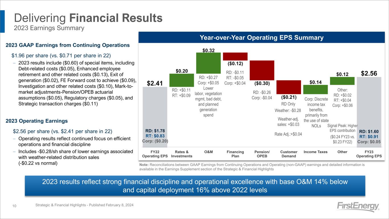 Delivering Financial Results 4Q 2023 Earnings Summary Strategic & Financial Highlights - Published February 8, 20249 4Q23 GAAP Earnings from Continuing Operations $0.30 per share (vs. -$0.71 per share in 4Q22) – 4Q 2023 results include ($0.32) of special items, including Enhanced employee retirement and other related costs ($0.03), FE Forward cost to achieve ($0.01) Investigation and other related costs (0.03), Mark-to-market adjustments-Pension/OPEB actuarial assumptions ($0.12), Regulatory charges ($0.02), and Strategic transaction charges ($0.11) 4Q23 Operating Earnings $0.62 per share (vs. $0.50 per share in 4Q22) – 4Q 2023 results in the upper half of the 4Q guidance range of $0.55-$0.65/sh – Includes -$0.04/sh of lower earnings associated with weather-related distribution sales (-$0.04 vs normal) Quarter-over-Quarter Operating EPS Summary Note: Reconciliations between GAAP Earnings from Continuing Operations and Operating (non-GAAP) earnings and detailed information is available in the Earnings Supplement section of the Strategic & Financial Highlights RD Only: Weather:-$0.04 RD: +$0.04 RT: +$0.01 RD: +$0.09 Corp: +$0.03 Lower labor, vegetation mgmt, bad debt, non-deferred storms, and reg gen spend Other: RD: +$0.01 RT: +$0.04 Corp: +$0.03 Signal Peak: Higher EPS contribution ($0.06 4Q23 vs. $0.05 4Q22) RD: $0.32 RT: $0.25 Corp: $0.05 RD: $0.32 RT: $0.20 Corp: ($0.02) RD: -$0.03 Corp: -$0.01 Our focus on efficient operations and financial discipline allowed us to deliver operating results in the upper half of the 4Q guidance range Corp: lower Consolidated effective tax rate RD Only