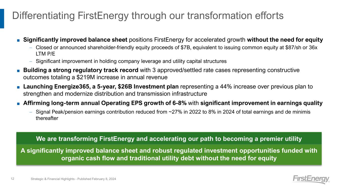 L-T Annual EPS Target 6-8% Growth Attractive Total Shareholder Return Target Dividend Payout 60-70% Dividend growth in line with Operating earnings Rate Base 9% Growth $29B in 2024 to $41B in 2028 Sustainable Regulatory Growth Plan Robust Investment Plan $26B CapEx from $4.3B in 2024 to $6.2B in 2028 FFO/Debt: 14-15% Significant improvement from FET 30% sale & organic cash flow growth Strengthening Balance Sheet No Additional Equity Needs Excl. Employee Benefit programs of up to $100M/year Strategic & Financial Highlights - Published February 8, 202411 Pathway to Strong Financial Future 2024-2028 Financial Plan $4.3B Investment Plan $2.61-$2.81/sh Earnings Guidance 7% growth vs. 2023 Guidance Midpoint 16% increase vs. ‘23 Spend and 2024 *See FactBook for more details on 2024 Guidance $1.70/sh (Subject to Board Approval) Plan to declare four dividends of $0.425/sh in ‘24; 6.25% increase vs. $1.60/sh declared in ‘23 $0.48-$0.58/SH: 1Q 2024 Guidance Dividends Declared Improved earnings quality