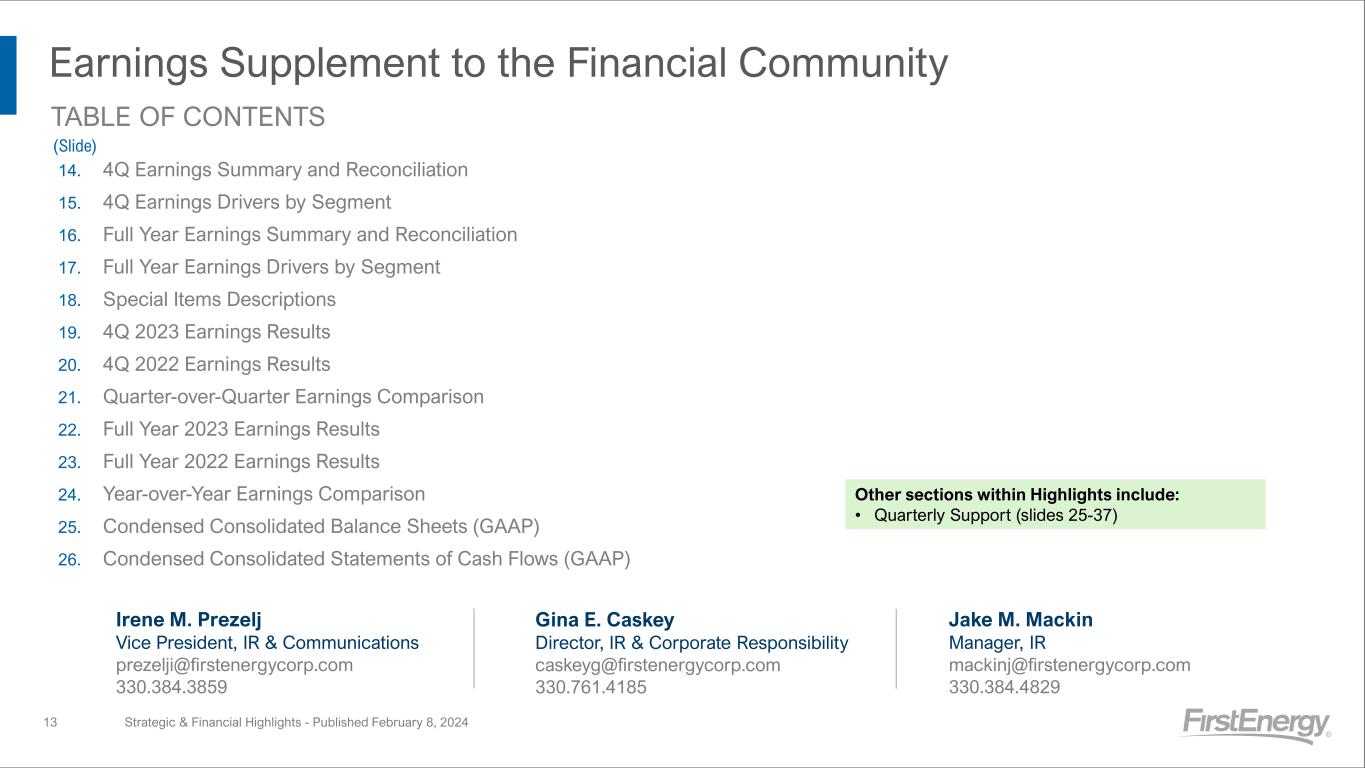 Earnings Supplement to the Financial Community Strategic & Financial Highlights - Published February 8, 2024 14. 4Q Earnings Summary and Reconciliation 15. 4Q Earnings Drivers by Segment 16. Full Year Earnings Summary and Reconciliation 17. Full Year Earnings Drivers by Segment 18. Special Items Descriptions 19. 4Q 2023 Earnings Results 20. 4Q 2022 Earnings Results 21. Quarter-over-Quarter Earnings Comparison 22. Full Year 2023 Earnings Results 23. Full Year 2022 Earnings Results 24. Year-over-Year Earnings Comparison 25. Condensed Consolidated Balance Sheets (GAAP) 26. Condensed Consolidated Statements of Cash Flows (GAAP) TABLE OF CONTENTS (Slide) Irene M. Prezelj Vice President, IR & Communications prezelji@firstenergycorp.com 330.384.3859 Gina E. Caskey Director, IR & Corporate Responsibility caskeyg@firstenergycorp.com 330.761.4185 Jake M. Mackin Manager, IR mackinj@firstenergycorp.com 330.384.4829 13 Other sections within Highlights include: • Quarterly Support (slides 25-37)