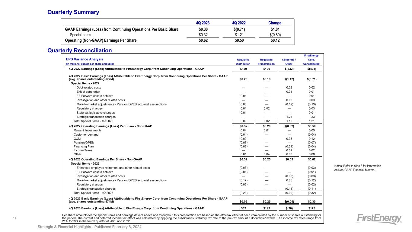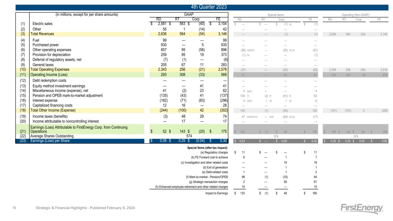 4th Quarter 2023 (in millions, except for per share amounts) GAAP Special Items Operating (Non-GAAP) RD RT Corp FE RD RT Corp FE RD RT Corp FE (1) Electric sales $ 2,581 $ 563 $ (40) $ 3,104 $ — $ — $ (1) (d) $ (1) (2) Other 55 1 (14) 42 — — — — (3) Total Revenues 2,636 564 (54) 3,146 — — (1) (1) 2,636 564 (55) 3,145 (4) Fuel 99 — — 99 — — — — (5) Purchased power 930 — 5 935 — — — — (6) Other operating expenses 857 95 (56) 896 (36) (a)(b)(h) — (25) (b)-(d) (61) (7) Provision for depreciation 259 95 19 373 (1) (b) — — (1) (8) Deferral of regulatory assets, net (7) (1) — (8) — — — — (9) General taxes 205 67 11 283 — — — — (10) Total Operating Expenses 2,343 256 (21) 2,578 (37) — (25) (62) 2,306 256 (46) 2,516 (11) Operating Income (Loss) 293 308 (33) 568 37 — 24 61 330 308 (9) 629 (12) Debt redemption costs — — — — — — — — (13) Equity method investment earnings — — 41 41 — — — — (14) Miscellaneous income (expense), net 41 (2) 23 62 4 (a)(h) — — 4 (15) Pension and OPEB mark-to-market adjustment (135) (43) 41 (137) 135 (f) (2) (f) (41) (f) 92 (16) Interest expense (162) (71) (63) (296) 4 (a)(e) 1 (e) 1 (e) 6 (17) Capitalized financing costs 12 16 — 28 — — — — (18) Total Other Income (Expense) (244) (100) 42 (302) 143 (1) (40) 102 (101) (101) 2 (200) (19) Income taxes (benefits) (3) 48 29 74 47 (a)(b)(e)-(h) — (e)(f) (64) (b)-(g) (17) (20) Income attributable to noncontrolling interest — 17 — 17 — — — — (21) Earnings (Loss) Attributable to FirstEnergy Corp. from Continuing Operations $ 52 $ 143 $ (20) $ 175 $ 133 $ (1) $ 48 $ 180 $ 185 $ 142 $ 28 $ 355 (22) Average Shares Outstanding 574 574 574 (23) Earnings (Loss) per Share $ 0.09 $ 0.25 $ (0.04) $ 0.30 $ 0.23 $ — $ 0.09 $ 0.32 $ 0.32 $ 0.25 $ 0.05 $ 0.62 Special Items (after-tax impact): (a) Regulatory charges $ 11 $ — $ — $ 11 (b) FE Forward cost to achieve 6 — 1 7 (c) Investigation and other related costs — — 19 19 (d) Exit of generation — — 1 1 (e) Debt-related costs 1 — 1 2 (f) Mark-to-market - Pension/OPEB 98 (1) (33) 64 (g) Strategic transaction charges 2 — 59 61 (h) Enhanced employee retirement and other related charges 15 — — 15 Impact to Earnings $ 133 $ (1) $ 48 $ 180 Strategic & Financial Highlights - Published February 8, 202419