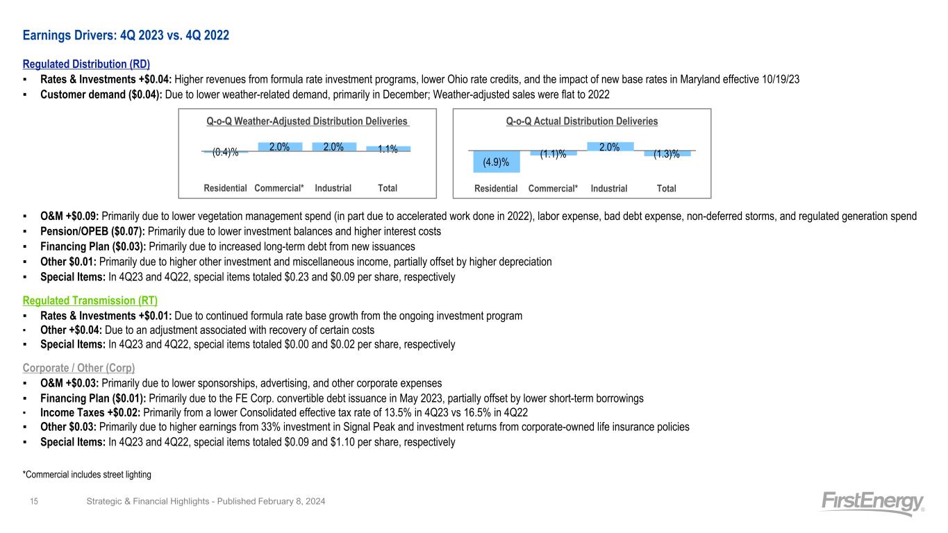 FirstEnergy EPS Variance Analysis Regulated Regulated Corporate / Corp. (in millions, except per share amounts) Distribution Transmission Other Consolidated 4Q 2022 Earnings (Loss) Attributable to FirstEnergy Corp. from Continuing Operations - GAAP $129 $100 $(632) $(403) 4Q 2022 Basic Earnings (Loss) Attributable to FirstEnergy Corp. from Continuing Operations Per Share - GAAP (avg. shares outstanding 572M) $0.23 $0.18 $(1.12) $(0.71) Special Items - 2022 Debt-related costs — — 0.02 0.02 Exit of generation — — 0.01 0.01 FE Forward cost to achieve 0.01 — — 0.01 Investigation and other related costs — — 0.03 0.03 Mark-to-market adjustments - Pension/OPEB actuarial assumptions 0.06 — (0.19) (0.13) Regulatory charges 0.01 0.02 — 0.03 State tax legislative changes 0.01 — — 0.01 Strategic transaction charges — — 1.23 1.23 Total Special Items - 4Q 2022 0.09 0.02 1.10 1.21 4Q 2022 Operating Earnings (Loss) Per Share - Non-GAAP $0.32 $0.20 $(0.02) $0.50 Rates & Investments 0.04 0.01 — 0.05 Customer demand (0.04) — — (0.04) O&M 0.09 — 0.03 0.12 Pension/OPEB (0.07) — — (0.07) Financing Plan (0.03) — (0.01) (0.04) Income Taxes — — 0.02 0.02 Other 0.01 0.04 0.03 0.08 4Q 2023 Operating Earnings Per Share - Non-GAAP $0.32 $0.25 $0.05 $0.62 Special Items - 2023 Enhanced employee retirement and other related costs (0.03) — — (0.03) FE Forward cost to achieve (0.01) — — (0.01) Investigation and other related costs — — (0.03) (0.03) Mark-to-market adjustments - Pension/OPEB actuarial assumptions (0.17) — 0.05 (0.12) Regulatory charges (0.02) — — (0.02) Strategic transaction charges — — (0.11) (0.11) Total Special Items - 4Q 2023 (0.23) — (0.09) (0.32) 4Q 2023 Basic Earnings (Loss) Attributable to FirstEnergy Corp. from Continuing Operations Per Share - GAAP (avg. shares outstanding 574M) $0.09 $0.25 $(0.04) $0.30 4Q 2023 Earnings (Loss) Attributable to FirstEnergy Corp. from Continuing Operations - GAAP $52 $143 $(20) $175 Per share amounts for the special items and earnings drivers above and throughout this presentation are based on the after-tax effect of each item divided by the number of shares outstanding for the period. The current and deferred income tax effect was calculated by applying the subsidiaries' statutory tax rate to the pre-tax amount if deductible/taxable. The income tax rates range from 21% to 29% in the fourth quarter of 2023 and 2022. Quarterly Summary Quarterly Reconciliation 4Q 2023 4Q 2022 Change GAAP Earnings (Loss) from Continuing Operations Per Basic Share $0.30 $(0.71) $1.01 Special Items $0.32 $1.21 $(0.89) Operating (Non-GAAP) Earnings Per Share $0.62 $0.50 $0.12 Notes: Refer to slide 3 for information on Non-GAAP Financial Matters. Strategic & Financial Highlights - Published February 8, 2024 14