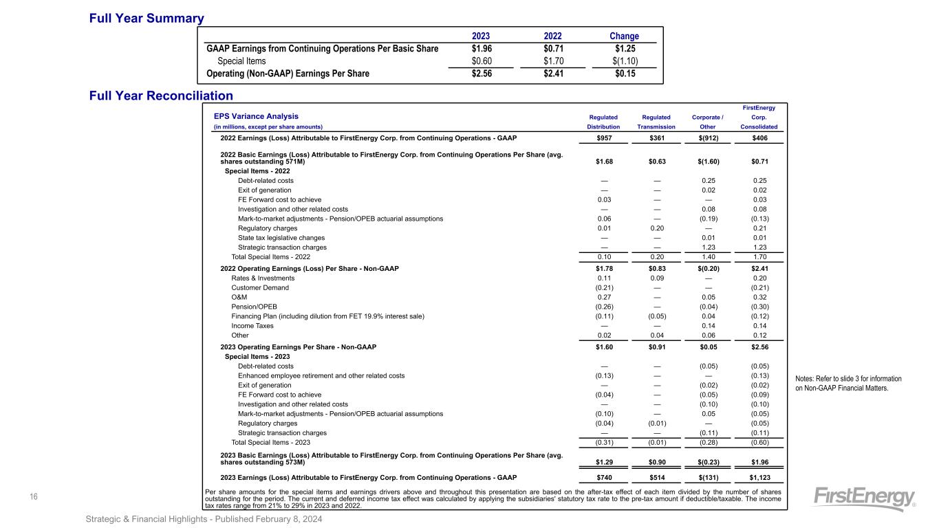 YTD December 2023 (in millions, except for per share amounts) GAAP Special Items Operating (Non-GAAP) RD RT Corp FE RD RT Corp FE RD RT Corp FE (1) Electric sales $ 10,814 $ 2,049 $ (170) $ 12,693 $ — $ 7 (a) $ (1) (d) $ 6 (2) Other 224 5 (52) 177 — — — — (3) Total Revenues 11,038 2,054 (222) 12,870 — 7 (1) 6 11,038 2,061 (223) 12,876 (4) Fuel 538 — — 538 — — — — (5) Purchased power 4,088 — 20 4,108 — — — — (6) Other operating expenses 3,364 423 (193) 3,594 (119) (a)(b)(h) (2) (a) (126) (b)-(d)(h) (247) (7) Provision for depreciation 1,021 367 73 1,461 (5) (b) — — (5) (8) Deferral of regulatory assets, net (256) (5) — (261) — — — — (9) General taxes 851 266 47 1,164 (1) (b) — — (1) (10) Total Operating Expenses 9,606 1,051 (53) 10,604 (125) (2) (126) (253) 9,481 1,049 (179) 10,351 (11) Operating Income (Loss) 1,432 1,003 (169) 2,266 125 9 125 259 1,557 1,012 (44) 2,525 (12) Debt redemption costs — — (36) (36) — — 36 (e) 36 (13) Equity method investment earnings — — 175 175 — — — — (14) Miscellaneous income (expense), net 130 2 32 164 34 (a)(h) — — 34 (15) Pension and OPEB mark-to-market adjustment (78) (36) 36 (78) 78 (f) (2) (f) (36) (f) 40 (16) Interest expense (618) (256) (250) (1,124) 4 (a)(b)(e) 1 (e) 1 (e) 6 (17) Capitalized financing costs 41 54 2 97 — — — — (18) Total Other Income (Expense) (525) (236) (41) (802) 116 (1) 1 116 (409) (237) (40) (686) (19) Income taxes (benefits) 167 179 (79) 267 62 (a)(b)(e)-(h) 2 (a)(e)(f) (34) (b)-(i) 30 (20) Income attributable to noncontrolling interest — 74 — 74 — — — — (21) Earnings (Loss) Attributable to FirstEnergy Corp. from Continuing Operations $ 740 $ 514 $ (131) $ 1,123 $ 179 $ 6 $ 160 $ 345 $ 919 $ 520 $ 29 $ 1,468 (22) Average Shares Outstanding 573 573 573 (23) Earnings (Loss) per Share $ 1.29 $ 0.90 $ (0.23) $ 1.96 $ 0.31 $ 0.01 $ 0.28 $ 0.60 $ 1.60 $ 0.91 $ 0.05 $ 2.56 Special Items (after-tax impact): (a) Regulatory charges $ 25 $ 7 $ — $ 32 (b) FE Forward cost to achieve 21 — 29 50 (c) Investigation and other related costs — — 61 61 (d) Exit of generation — — 9 9 (e) Debt-related costs 1 — 29 30 (f) Mark-to-market - Pension/OPEB 56 (1) (29) 26 (g) Strategic transaction charges 2 — 59 61 (h) Enhanced employee retirement and other related charges 74 — 1 75 (i) State tax legislative changes — — 1 1 Impact to Earnings $ 179 $ 6 $ 160 $ 345 Strategic & Financial Highlights - Published February 8, 202422