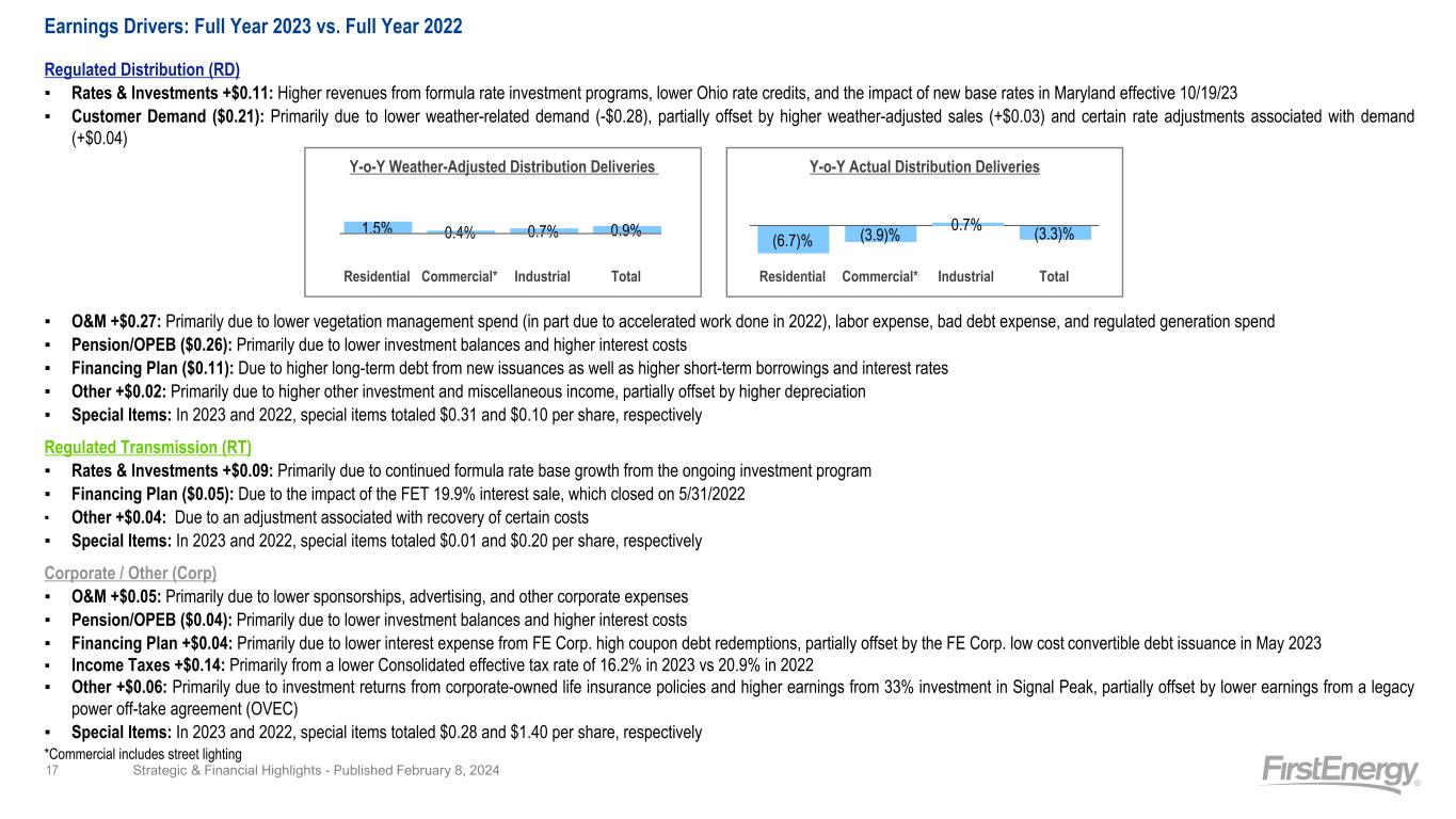 FirstEnergy EPS Variance Analysis Regulated Regulated Corporate / Corp. (in millions, except per share amounts) Distribution Transmission Other Consolidated 2022 Earnings (Loss) Attributable to FirstEnergy Corp. from Continuing Operations - GAAP $957 $361 $(912) $406 2022 Basic Earnings (Loss) Attributable to FirstEnergy Corp. from Continuing Operations Per Share (avg. shares outstanding 571M) $1.68 $0.63 $(1.60) $0.71 Special Items - 2022 Debt-related costs — — 0.25 0.25 Exit of generation — — 0.02 0.02 FE Forward cost to achieve 0.03 — — 0.03 Investigation and other related costs — — 0.08 0.08 Mark-to-market adjustments - Pension/OPEB actuarial assumptions 0.06 — (0.19) (0.13) Regulatory charges 0.01 0.20 — 0.21 State tax legislative changes — — 0.01 0.01 Strategic transaction charges — — 1.23 1.23 Total Special Items - 2022 0.10 0.20 1.40 1.70 2022 Operating Earnings (Loss) Per Share - Non-GAAP $1.78 $0.83 $(0.20) $2.41 Rates & Investments 0.11 0.09 — 0.20 Customer Demand (0.21) — — (0.21) O&M 0.27 — 0.05 0.32 Pension/OPEB (0.26) — (0.04) (0.30) Financing Plan (including dilution from FET 19.9% interest sale) (0.11) (0.05) 0.04 (0.12) Income Taxes — — 0.14 0.14 Other 0.02 0.04 0.06 0.12 2023 Operating Earnings Per Share - Non-GAAP $1.60 $0.91 $0.05 $2.56 Special Items - 2023 Debt-related costs — — (0.05) (0.05) Enhanced employee retirement and other related costs (0.13) — — (0.13) Exit of generation — — (0.02) (0.02) FE Forward cost to achieve (0.04) — (0.05) (0.09) Investigation and other related costs — — (0.10) (0.10) Mark-to-market adjustments - Pension/OPEB actuarial assumptions (0.10) — 0.05 (0.05) Regulatory charges (0.04) (0.01) — (0.05) Strategic transaction charges — — (0.11) (0.11) Total Special Items - 2023 (0.31) (0.01) (0.28) (0.60) 2023 Basic Earnings (Loss) Attributable to FirstEnergy Corp. from Continuing Operations Per Share (avg. shares outstanding 573M) $1.29 $0.90 $(0.23) $1.96 2023 Earnings (Loss) Attributable to FirstEnergy Corp. from Continuing Operations - GAAP $740 $514 $(131) $1,123 Per share amounts for the special items and earnings drivers above and throughout this presentation are based on the after-tax effect of each item divided by the number of shares outstanding for the period. The current and deferred income tax effect was calculated by applying the subsidiaries' statutory tax rate to the pre-tax amount if deductible/taxable. The income tax rates range from 21% to 29% in 2023 and 2022. Full Year Summary Full Year Reconciliation 2023 2022 Change GAAP Earnings from Continuing Operations Per Basic Share $1.96 $0.71 $1.25 Special Items $0.60 $1.70 $(1.10) Operating (Non-GAAP) Earnings Per Share $2.56 $2.41 $0.15 Notes: Refer to slide 3 for information on Non-GAAP Financial Matters. Strategic & Financial Highlights - Published February 8, 2024 16