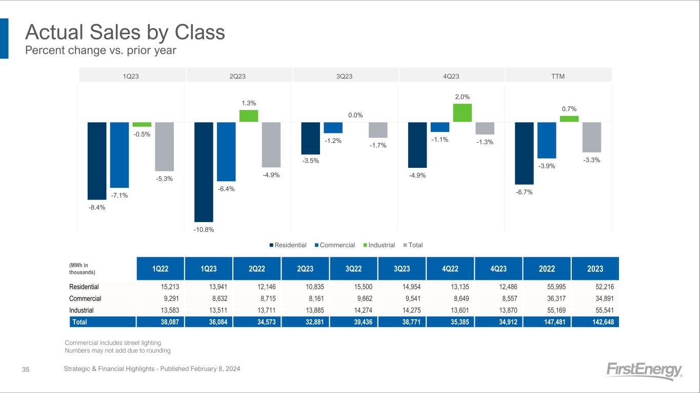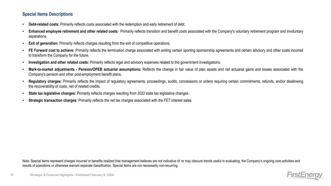 Special Items Descriptions ▪ Debt-related costs: Primarily reflects costs associated with the redemption and early retirement of debt. ▪ Enhanced employee retirement and other related costs: Primarily reflects transition and benefit costs associated with the Company's voluntary retirement program and involuntary separations. ▪ Exit of generation: Primarily reflects charges resulting from the exit of competitive operations. ▪ FE Forward cost to achieve: Primarily reflects the termination charge associated with exiting certain sporting sponsorship agreements and certain advisory and other costs incurred to transform the Company for the future. ▪ Investigation and other related costs: Primarily reflects legal and advisory expenses related to the government investigations. ▪ Mark-to-market adjustments - Pension/OPEB actuarial assumptions: Reflects the change in fair value of plan assets and net actuarial gains and losses associated with the Company's pension and other post-employment benefit plans. ▪ Regulatory charges: Primarily reflects the impact of regulatory agreements, proceedings, audits, concessions or orders requiring certain commitments, refunds, and/or disallowing the recoverability of costs, net of related credits. ▪ State tax legislative changes: Primarily reflects charges resulting from 2022 state tax legislative changes. ▪ Strategic transaction charges: Primarily reflects the net tax charges associated with the FET interest sales. Note: Special items represent charges incurred or benefits realized that management believes are not indicative of, or may obscure trends useful in evaluating, the Company’s ongoing core activities and results of operations or otherwise warrant separate classification. Special items are not necessarily non-recurring. Strategic & Financial Highlights - Published February 8, 202418