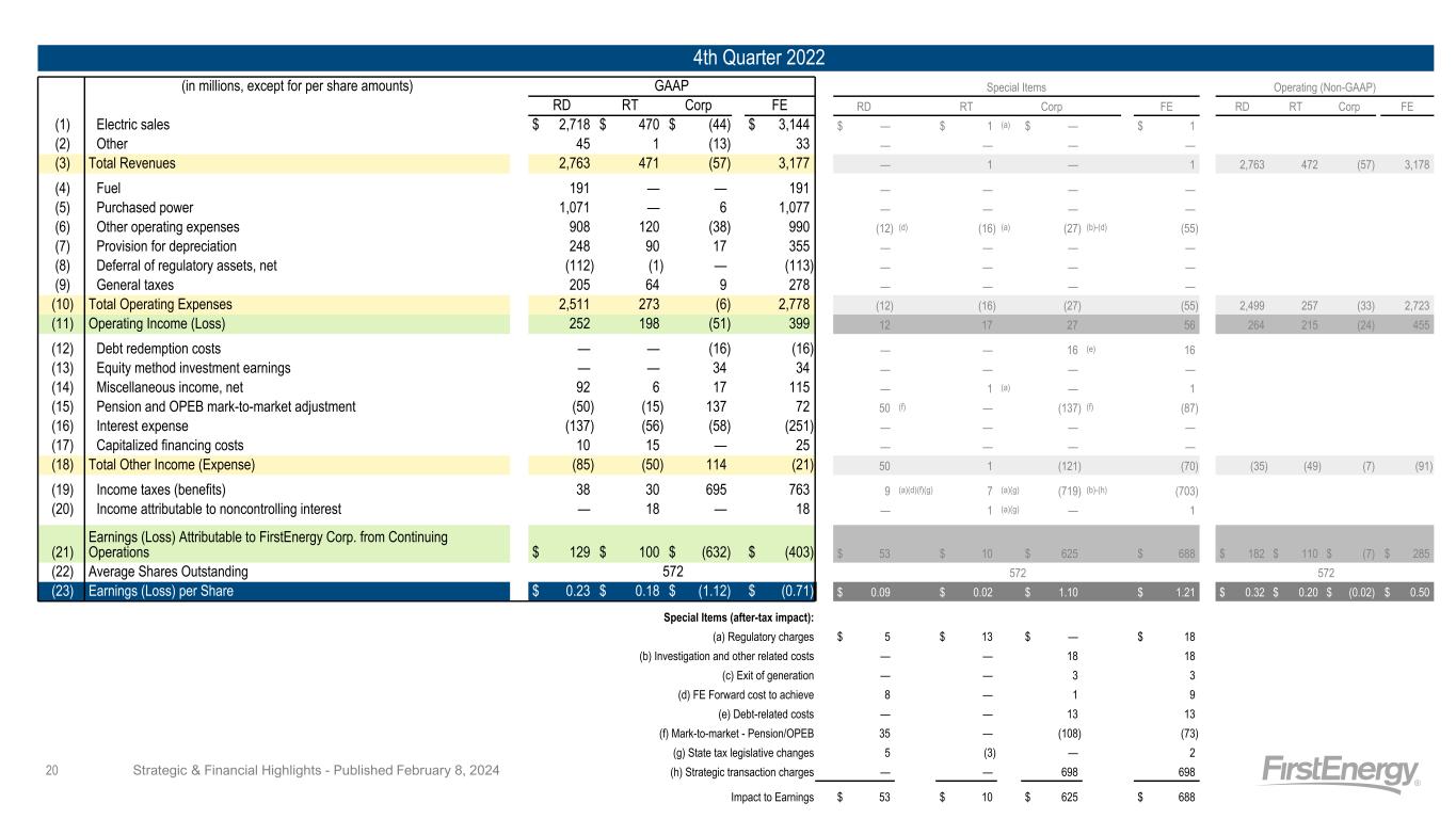 4th Quarter 2022 (in millions, except for per share amounts) GAAP Special Items Operating (Non-GAAP) RD RT Corp FE RD RT Corp FE RD RT Corp FE (1) Electric sales $ 2,718 $ 470 $ (44) $ 3,144 $ — $ 1 (a) $ — $ 1 (2) Other 45 1 (13) 33 — — — — (3) Total Revenues 2,763 471 (57) 3,177 — 1 — 1 2,763 472 (57) 3,178 (4) Fuel 191 — — 191 — — — — (5) Purchased power 1,071 — 6 1,077 — — — — (6) Other operating expenses 908 120 (38) 990 (12) (d) (16) (a) (27) (b)-(d) (55) (7) Provision for depreciation 248 90 17 355 — — — — (8) Deferral of regulatory assets, net (112) (1) — (113) — — — — (9) General taxes 205 64 9 278 — — — — (10) Total Operating Expenses 2,511 273 (6) 2,778 (12) (16) (27) (55) 2,499 257 (33) 2,723 (11) Operating Income (Loss) 252 198 (51) 399 12 17 27 56 264 215 (24) 455 (12) Debt redemption costs — — (16) (16) — — 16 (e) 16 (13) Equity method investment earnings — — 34 34 — — — — (14) Miscellaneous income, net 92 6 17 115 — 1 (a) — 1 (15) Pension and OPEB mark-to-market adjustment (50) (15) 137 72 50 (f) — (137) (f) (87) (16) Interest expense (137) (56) (58) (251) — — — — (17) Capitalized financing costs 10 15 — 25 — — — — (18) Total Other Income (Expense) (85) (50) 114 (21) 50 1 (121) (70) (35) (49) (7) (91) (19) Income taxes (benefits) 38 30 695 763 9 (a)(d)(f)(g) 7 (a)(g) (719) (b)-(h) (703) (20) Income attributable to noncontrolling interest — 18 — 18 — 1 (a)(g) — 1 (21) Earnings (Loss) Attributable to FirstEnergy Corp. from Continuing Operations $ 129 $ 100 $ (632) $ (403) $ 53 $ 10 $ 625 $ 688 $ 182 $ 110 $ (7) $ 285 (22) Average Shares Outstanding 572 572 572 (23) Earnings (Loss) per Share $ 0.23 $ 0.18 $ (1.12) $ (0.71) $ 0.09 $ 0.02 $ 1.10 $ 1.21 $ 0.32 $ 0.20 $ (0.02) $ 0.50 Special Items (after-tax impact): (a) Regulatory charges $ 5 $ 13 $ — $ 18 (b) Investigation and other related costs — — 18 18 (c) Exit of generation — — 3 3 (d) FE Forward cost to achieve 8 — 1 9 (e) Debt-related costs — — 13 13 (f) Mark-to-market - Pension/OPEB 35 — (108) (73) (g) State tax legislative changes 5 (3) — 2 (h) Strategic transaction charges — — 698 698 Impact to Earnings $ 53 $ 10 $ 625 $ 688 Strategic & Financial Highlights - Published February 8, 202420