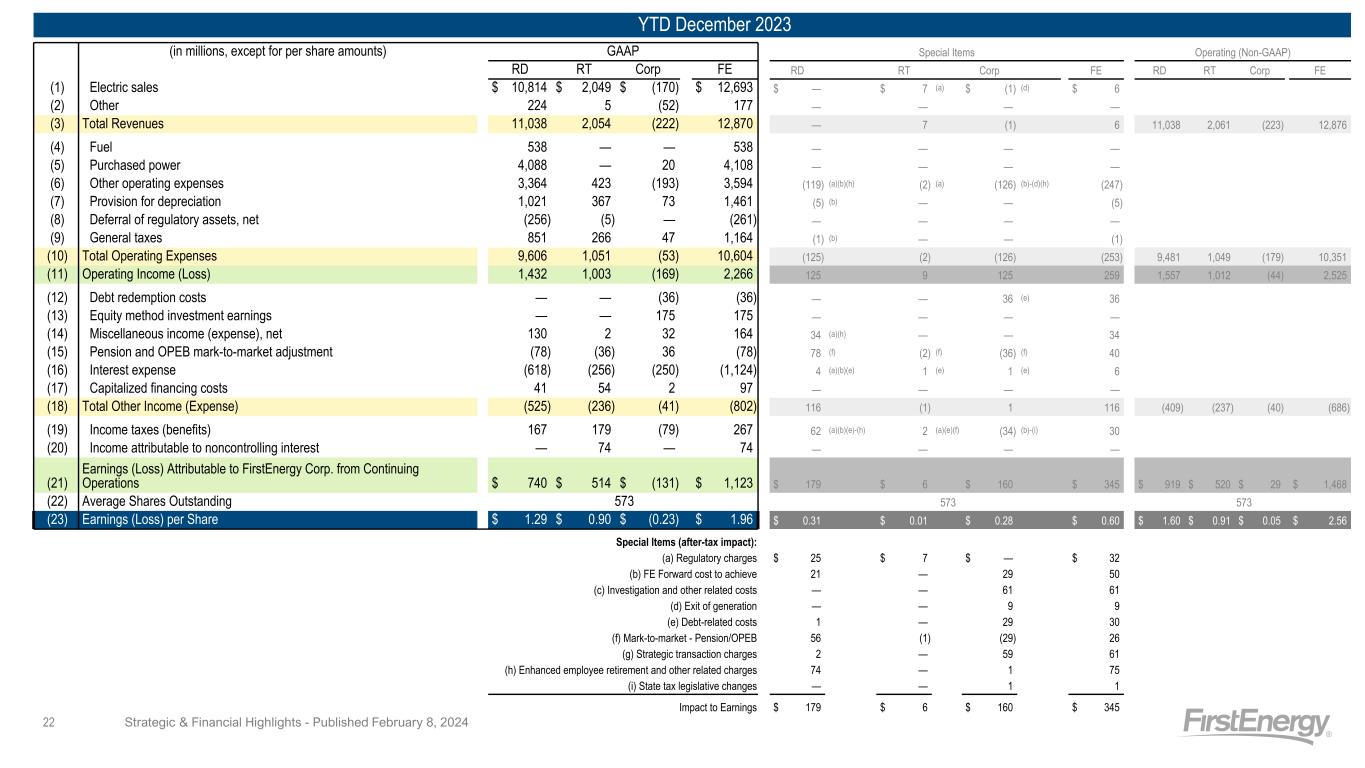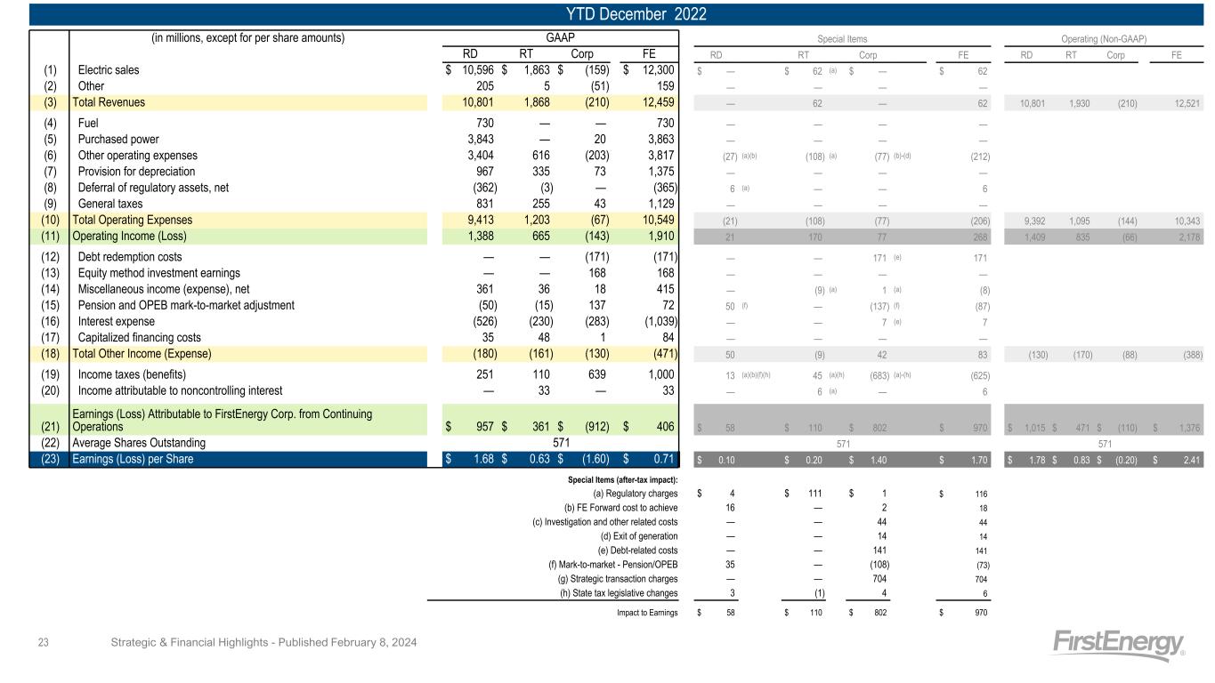 YTD December 2022 (in millions, except for per share amounts) GAAP Special Items Operating (Non-GAAP) RD RT Corp FE RD RT Corp FE RD RT Corp FE (1) Electric sales $ 10,596 $ 1,863 $ (159) $ 12,300 $ — $ 62 (a) $ — $ 62 (2) Other 205 5 (51) 159 — — — — (3) Total Revenues 10,801 1,868 (210) 12,459 — 62 — 62 10,801 1,930 (210) 12,521 (4) Fuel 730 — — 730 — — — — (5) Purchased power 3,843 — 20 3,863 — — — — (6) Other operating expenses 3,404 616 (203) 3,817 (27) (a)(b) (108) (a) (77) (b)-(d) (212) (7) Provision for depreciation 967 335 73 1,375 — — — — (8) Deferral of regulatory assets, net (362) (3) — (365) 6 (a) — — 6 (9) General taxes 831 255 43 1,129 — — — — (10) Total Operating Expenses 9,413 1,203 (67) 10,549 (21) (108) (77) (206) 9,392 1,095 (144) 10,343 (11) Operating Income (Loss) 1,388 665 (143) 1,910 21 170 77 268 1,409 835 (66) 2,178 (12) Debt redemption costs — — (171) (171) — — 171 (e) 171 (13) Equity method investment earnings — — 168 168 — — — — (14) Miscellaneous income (expense), net 361 36 18 415 — (9) (a) 1 (a) (8) (15) Pension and OPEB mark-to-market adjustment (50) (15) 137 72 50 (f) — (137) (f) (87) (16) Interest expense (526) (230) (283) (1,039) — — 7 (e) 7 (17) Capitalized financing costs 35 48 1 84 — — — — (18) Total Other Income (Expense) (180) (161) (130) (471) 50 (9) 42 83 (130) (170) (88) (388) (19) Income taxes (benefits) 251 110 639 1,000 13 (a)(b)(f)(h) 45 (a)(h) (683) (a)-(h) (625) (20) Income attributable to noncontrolling interest — 33 — 33 — 6 (a) — 6 (21) Earnings (Loss) Attributable to FirstEnergy Corp. from Continuing Operations $ 957 $ 361 $ (912) $ 406 $ 58 $ 110 $ 802 $ 970 $ 1,015 $ 471 $ (110) $ 1,376 (22) Average Shares Outstanding 571 571 571 (23) Earnings (Loss) per Share $ 1.68 $ 0.63 $ (1.60) $ 0.71 $ 0.10 $ 0.20 $ 1.40 $ 1.70 $ 1.78 $ 0.83 $ (0.20) $ 2.41 Special Items (after-tax impact): (a) Regulatory charges $ 4 $ 111 $ 1 $ 116 (b) FE Forward cost to achieve 16 — 2 18 (c) Investigation and other related costs — — 44 44 (d) Exit of generation — — 14 14 (e) Debt-related costs — — 141 141 (f) Mark-to-market - Pension/OPEB 35 — (108) (73) (g) Strategic transaction charges — — 704 704 (h) State tax legislative changes 3 (1) 4 6 Impact to Earnings $ 58 $ 110 $ 802 $ 970 Strategic & Financial Highlights - Published February 8, 202423