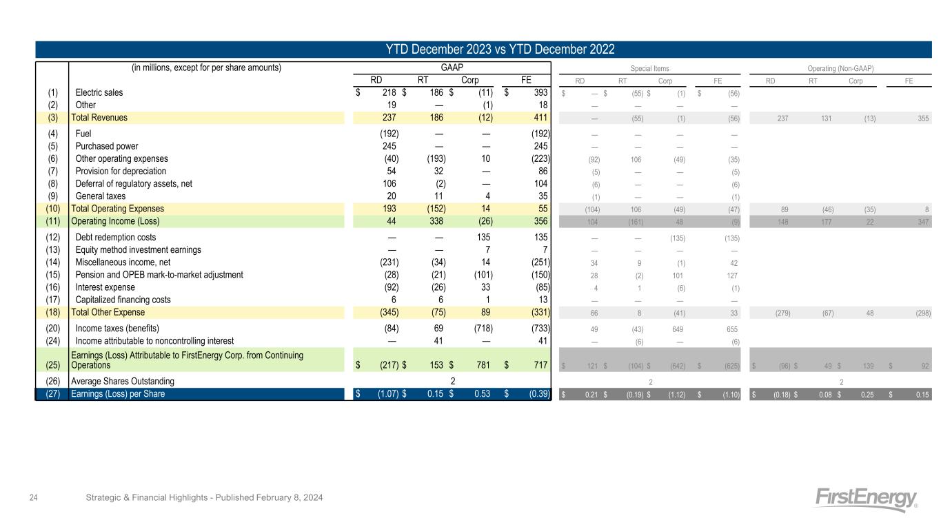 YTD December 2023 vs YTD December 2022 (in millions, except for per share amounts) GAAP Special Items Operating (Non-GAAP) RD RT Corp FE RD RT Corp FE RD RT Corp FE (1) Electric sales $ 218 $ 186 $ (11) $ 393 $ — $ (55) $ (1) $ (56) (2) Other 19 — (1) 18 — — — — (3) Total Revenues 237 186 (12) 411 — (55) (1) (56) 237 131 (13) 355 (4) Fuel (192) — — (192) — — — — (5) Purchased power 245 — — 245 — — — — (6) Other operating expenses (40) (193) 10 (223) (92) 106 (49) (35) (7) Provision for depreciation 54 32 — 86 (5) — — (5) (8) Deferral of regulatory assets, net 106 (2) — 104 (6) — — (6) (9) General taxes 20 11 4 35 (1) — — (1) (10) Total Operating Expenses 193 (152) 14 55 (104) 106 (49) (47) 89 (46) (35) 8 (11) Operating Income (Loss) 44 338 (26) 356 104 (161) 48 (9) 148 177 22 347 (12) Debt redemption costs — — 135 135 — — (135) (135) (13) Equity method investment earnings — — 7 7 — — — — (14) Miscellaneous income, net (231) (34) 14 (251) 34 9 (1) 42 (15) Pension and OPEB mark-to-market adjustment (28) (21) (101) (150) 28 (2) 101 127 (16) Interest expense (92) (26) 33 (85) 4 1 (6) (1) (17) Capitalized financing costs 6 6 1 13 — — — — (18) Total Other Expense (345) (75) 89 (331) 66 8 (41) 33 (279) (67) 48 (298) (20) Income taxes (benefits) (84) 69 (718) (733) 49 (43) 649 655 (24) Income attributable to noncontrolling interest — 41 — 41 — (6) — (6) (25) Earnings (Loss) Attributable to FirstEnergy Corp. from Continuing Operations $ (217) $ 153 $ 781 $ 717 $ 121 $ (104) $ (642) $ (625) $ (96) $ 49 $ 139 $ 92 (26) Average Shares Outstanding 2 2 2 (27) Earnings (Loss) per Share $ (1.07) $ 0.15 $ 0.53 $ (0.39) $ 0.21 $ (0.19) $ (1.12) $ (1.10) $ (0.18) $ 0.08 $ 0.25 $ 0.15 Strategic & Financial Highlights - Published February 8, 202424