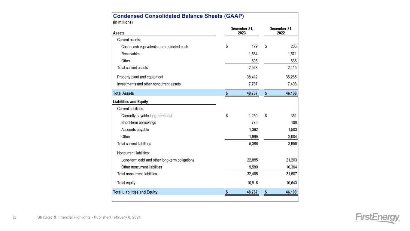 Condensed Consolidated Balance Sheets (GAAP) (in millions) Assets December 31, 2023 December 31, 2022 Current assets: Cash, cash equivalents and restricted cash $ 179 $ 206 Receivables 1,584 1,571 Other 805 638 Total current assets 2,568 2,415 Property plant and equipment 38,412 36,285 Investments and other noncurrent assets 7,787 7,408 Total Assets $ 48,767 $ 46,108 Liabilities and Equity Current liabilities: Currently payable long-term debt $ 1,250 $ 351 Short-term borrowings 775 100 Accounts payable 1,362 1,503 Other 1,999 2,004 Total current liabilities 5,386 3,958 Noncurrent liabilities: Long-term debt and other long-term obligations 22,885 21,203 Other noncurrent liabilities 9,580 10,304 Total noncurrent liabilities 32,465 31,507 Total equity 10,916 10,643 Total Liabilities and Equity $ 48,767 $ 46,108 Strategic & Financial Highlights - Published February 8, 202425