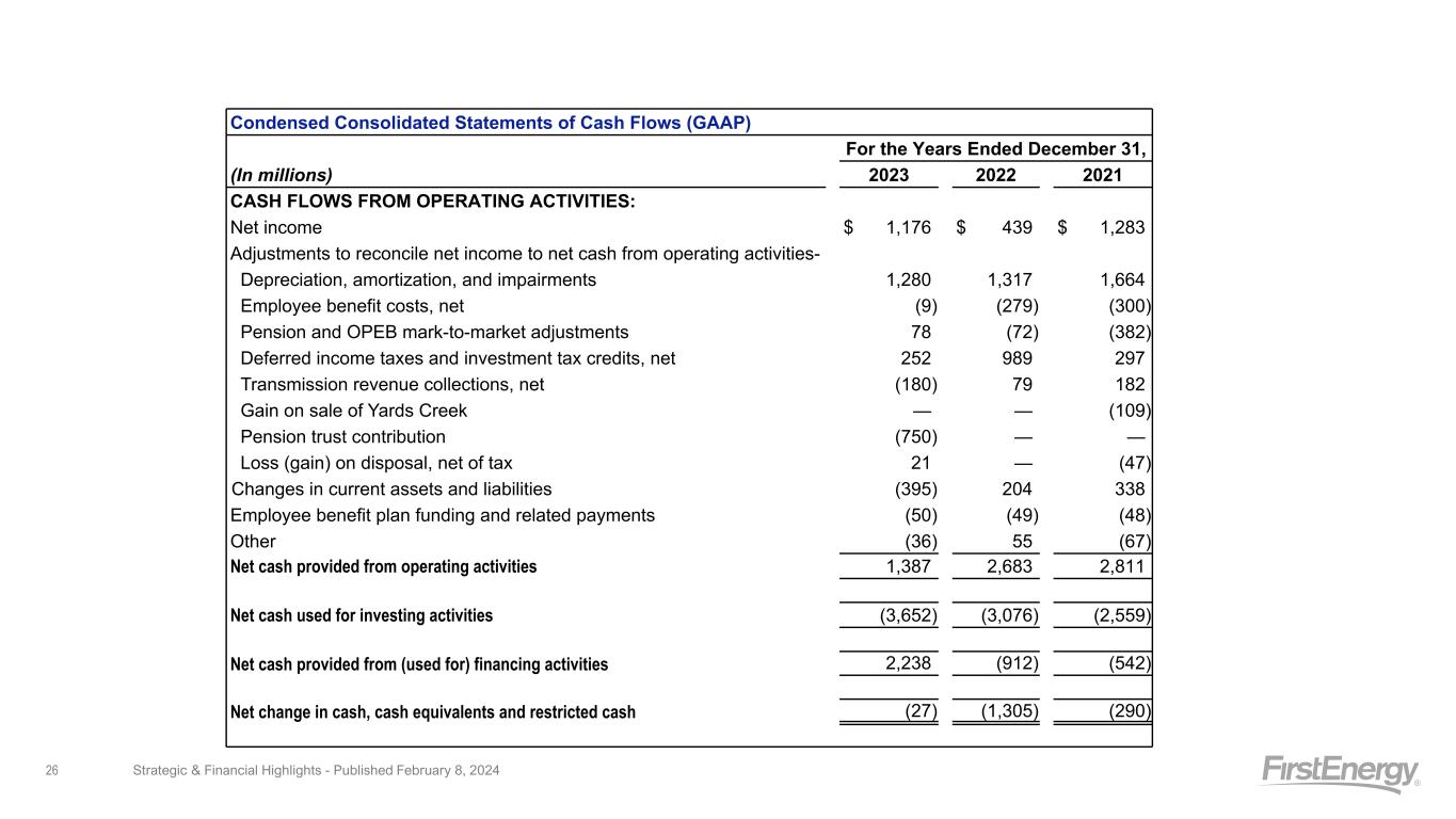 Condensed Consolidated Statements of Cash Flows (GAAP) For the Years Ended December 31, (In millions) 2023 2022 2021 CASH FLOWS FROM OPERATING ACTIVITIES: Net income $ 1,176 $ 439 $ 1,283 Adjustments to reconcile net income to net cash from operating activities- Depreciation, amortization, and impairments 1,280 1,317 1,664 Employee benefit costs, net (9) (279) (300) Pension and OPEB mark-to-market adjustments 78 (72) (382) Deferred income taxes and investment tax credits, net 252 989 297 Transmission revenue collections, net (180) 79 182 Gain on sale of Yards Creek — — (109) Pension trust contribution (750) — — Loss (gain) on disposal, net of tax 21 — (47) Changes in current assets and liabilities (395) 204 338 Employee benefit plan funding and related payments (50) (49) (48) Other (36) 55 (67) Net cash provided from operating activities 1,387 2,683 2,811 Net cash used for investing activities (3,652) (3,076) (2,559) Net cash provided from (used for) financing activities 2,238 (912) (542) Net change in cash, cash equivalents and restricted cash (27) (1,305) (290) Strategic & Financial Highlights - Published February 8, 202426