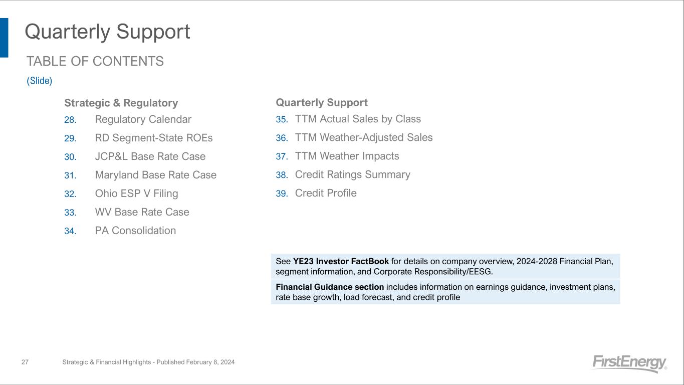 Quarterly Support Strategic & Financial Highlights - Published February 8, 2024 Strategic & Regulatory 28. Regulatory Calendar 29. RD Segment-State ROEs 30. JCP&L Base Rate Case 31. Maryland Base Rate Case 32. Ohio ESP V Filing 33. WV Base Rate Case 34. PA Consolidation TABLE OF CONTENTS (Slide) 27 Quarterly Support 35. TTM Actual Sales by Class 36. TTM Weather-Adjusted Sales 37. TTM Weather Impacts 38. Credit Ratings Summary 39. Credit Profile See YE23 Investor FactBook for details on company overview, 2024-2028 Financial Plan, segment information, and Corporate Responsibility/EESG. Financial Guidance section includes information on earnings guidance, investment plans, rate base growth, load forecast, and credit profile