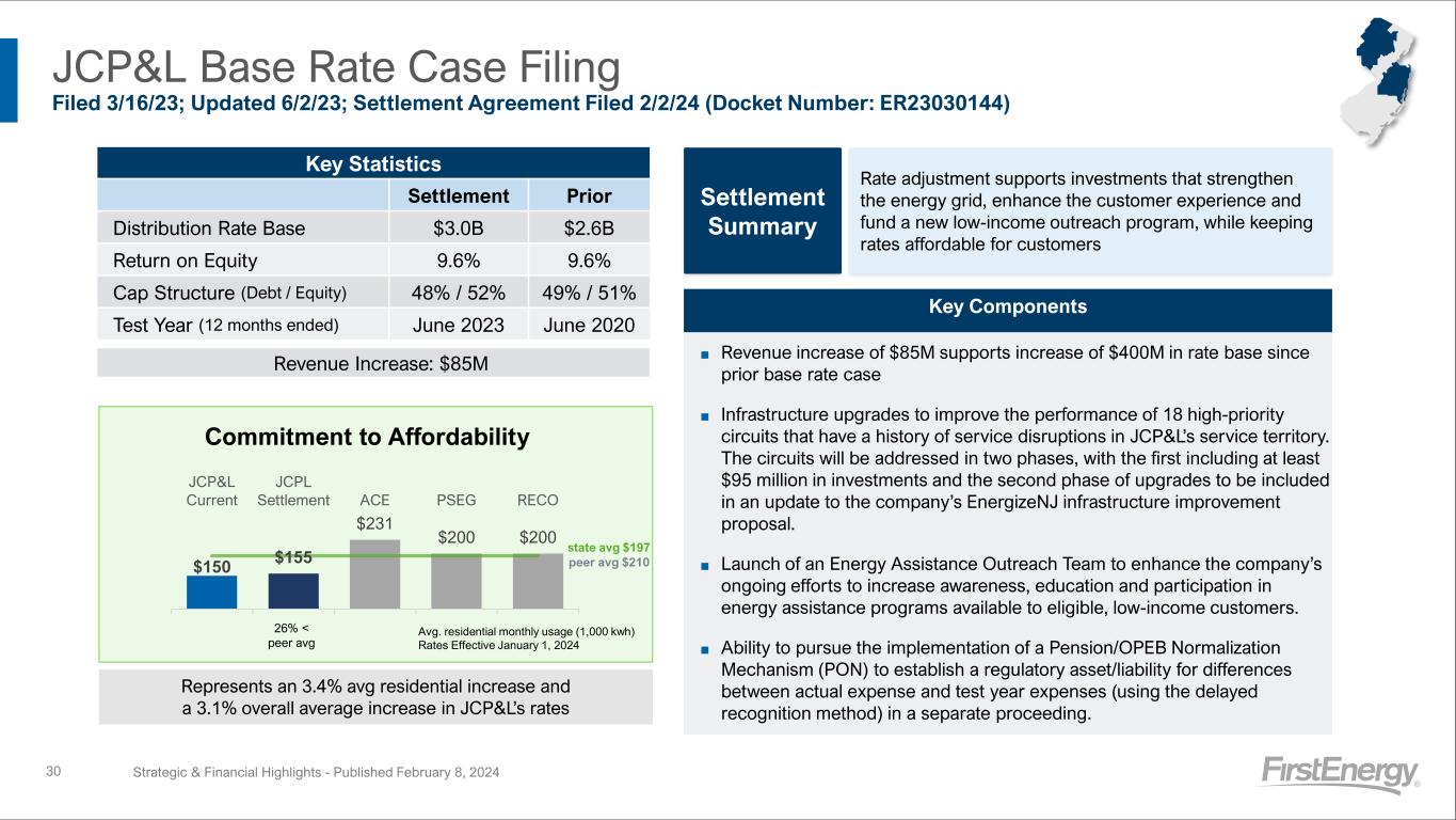 RD Segment – State ROEs TTM 12/31/23 29 Strategic & Financial Highlights - Published February 8, 2024 Rate base at 12/31/23 $4.2B $6.6B $3.1B $3.2B $0.7B Equity/Total Capitalization(1) 49% 49% 52% 49% 50% ROE EPS Sensitivity +/- 1% ~$0.04 ~$0.05 ~$0.03 ~$0.03 ~$0.01 Approved/Filed Test Year Feb. 2008 (TTM) Dec. 2017 (Projected) June 2023 (TTM) Dec. 2022 (TTM) Dec. 2022 (TTM) Key Regulatory Adjustments 5.8% 9.2% 4.1% 7.7% 4.7% 0% 5% 10% OH PA NJ WV MD (2) All States OH PA NJ WV MD • Actual revenue, not weather normalized • Income taxes calculated using statutory rates or consistent with practice used in base rate case filings • Excludes subsidiary company earnings (PP)(4) • Rider DCR revenue equal to the allowed revenue cap • Includes pension/OPEB service costs only; excludes amortization of actuarial losses and other non-service credits • Pension based on 10-year historical cash contributions (consistent with certain other utilities in PA) • OPEB based on current year service costs • Includes total pension expense (credit) including use of delayed recognition method(3) for pension/OPEB actuarial losses (i.e., MTM adjustments) • Consolidated Tax Adjustment to rate base, based on Commission’s practice • Separation study uses various allocation methods to separate PE into WV, MD, and VA • Includes total pension expense (credit) including use of delayed recognition method(3) for pension/OPEB actuarial losses (i.e., MTM adjustments) • Excludes impact of AGC (Bath) and the securitized Ft. Martin scrubbers • Separation study uses various allocation methods to separate PE into WV, MD, and VA • Includes total pension expense (credit) including use of delayed recognition method(3) for pension/OPEB actuarial losses (i.e., MTM adjustments) (1) Calculated using allowed capital structure for OH, actual for PA, WV & MD, and actual for NJ (adjusted for Goodwill) – consistent methodology as the last base rate case and/or quarterly earnings reports, as applicable (2) ROE and rate base represent the filed position by the Company in its pending rate case. WV includes generation and transmission (3) Consistent with amortization of actuarial gains and losses (4) As a result of PA Consolidation, as of 1/1/24, PP will no longer be a subsidiary of OE. (2) As updated in pending rate case As filed in pending rate case