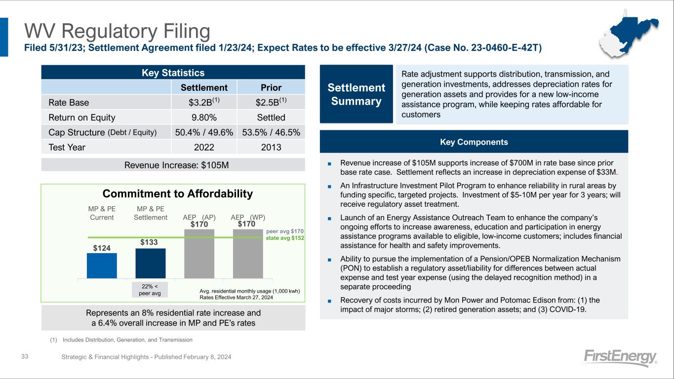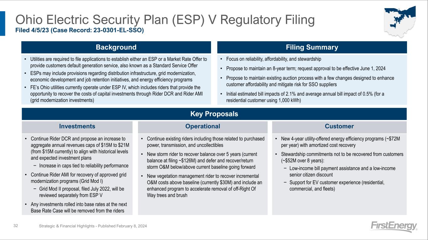 Ohio Electric Security Plan (ESP) V Regulatory Filing Filed 4/5/23 (Case Record: 23-0301-EL-SSO) Strategic & Financial Highlights - Published February 8, 202432 Background • Utilities are required to file applications to establish either an ESP or a Market Rate Offer to provide customers default generation service, also known as a Standard Service Offer • ESPs may include provisions regarding distribution infrastructure, grid modernization, economic development and job retention initiatives, and energy efficiency programs • FE’s Ohio utilities currently operate under ESP IV, which includes riders that provide the opportunity to recover the costs of capital investments through Rider DCR and Rider AMI (grid modernization investments) Filing Summary • Focus on reliability, affordability, and stewardship • Propose to maintain an 8-year term; request approval to be effective June 1, 2024 • Propose to maintain existing auction process with a few changes designed to enhance customer affordability and mitigate risk for SSO suppliers • Initial estimated bill impacts of 2.1% and average annual bill impact of 0.5% (for a residential customer using 1,000 kWh) Key Proposals Investments Operational Customer • Continue Rider DCR and propose an increase to aggregate annual revenues caps of $15M to $21M (from $15M currently) to align with historical levels and expected investment plans − Increase in caps tied to reliability performance • Continue Rider AMI for recovery of approved grid modernization programs (Grid Mod I) − Grid Mod II proposal, filed July 2022, will be reviewed separately from ESP V • Any investments rolled into base rates at the next Base Rate Case will be removed from the riders • Continue existing riders including those related to purchased power, transmission, and uncollectibles • New storm rider to recover balance over 5 years (current balance at filing ~$126M) and defer and recover/return storm O&M below/above current baseline going forward • New vegetation management rider to recover incremental O&M costs above baseline (currently $30M) and include an enhanced program to accelerate removal of off-Right Of Way trees and brush • New 4-year utility-offered energy efficiency programs (~$72M per year) with amortized cost recovery • Stewardship commitments not to be recovered from customers (~$52M over 8 years): − Low-income bill payment assistance and a low-income senior citizen discount − Support for EV customer experience (residential, commercial, and fleets)