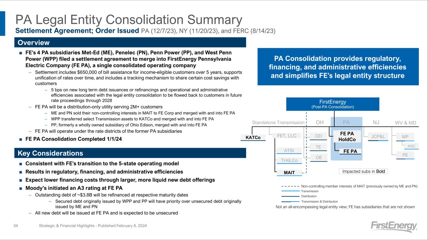 TrAILCo PA Legal Entity Consolidation Summary Settlement Agreement; Order Issued PA (12/7/23), NY (11/20/23), and FERC (8/14/23) ■ FE’s 4 PA subsidiaries Met-Ed (ME), Penelec (PN), Penn Power (PP), and West Penn Power (WPP) filed a settlement agreement to merge into FirstEnergy Pennsylvania Electric Company (FE PA), a single consolidated operating company – Settlement includes $650,000 of bill assistance for income-eligible customers over 5 years, supports unification of rates over time, and includes a tracking mechanism to share certain cost savings with customers – 5 bps on new long term debt issuances or refinancings and operational and administrative efficiencies associated with the legal entity consolidation to be flowed back to customers in future rate proceedings through 2028 – FE PA will be a distribution-only utility serving 2M+ customers – ME and PN sold their non-controlling interests in MAIT to FE Corp and merged with and into FE PA – WPP transferred select Transmission assets to KATCo and merged with and into FE PA – PP, formerly a wholly owned subsidiary of Ohio Edison, merged with and into FE PA – FE PA will operate under the rate districts of the former PA subsidiaries ■ FE PA Consolidation Completed 1/1/24 ■ Consistent with FE’s transition to the 5-state operating model ■ Results in regulatory, financing, and administrative efficiencies ■ Expect lower financing costs through larger, more liquid new debt offerings ■ Moody's initiated an A3 rating at FE PA – Outstanding debt of ~$3.8B will be refinanced at respective maturity dates – Secured debt originally issued by WPP and PP will have priority over unsecured debt originally issued by ME and PN – All new debt will be issued at FE PA and is expected to be unsecured CEI TE FE PA HoldCo ATSI FET, LLC OE OH PAStandalone Transmission KATCo MAIT Non-controlling member interests of MAIT (previously owned by ME and PN) Not an all-encompassing legal entity view; FE has subsidiaries that are not shown FE PA NJ JCP&L AGC WV & MD MP PE Overview Impacted subs in Bold FirstEnergy (Post-PA Consolidation) PA Consolidation provides regulatory, financing, and administrative efficiencies and simplifies FE’s legal entity structure Distribution Transmission Transmission & Distribution Key Considerations Strategic & Financial Highlights - Published February 8, 202434
