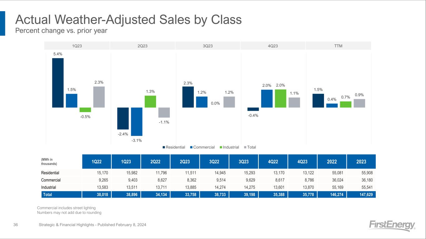 Actual Sales by Class Percent change vs. prior year 35 -8.4% -10.8% -3.5% -4.9% -6.7%-7.1% -6.4% -1.2% -1.1% -3.9% -0.5% 1.3% 0.0% 2.0% 0.7% -5.3% -4.9% -1.7% -1.3% -3.3% 1Q23 2Q23 3Q23 4Q23 TTM Residential Commercial Industrial Total Commercial includes street lighting Numbers may not add due to rounding Strategic & Financial Highlights - Published February 8, 2024 (MWh in thousands) 1Q22 1Q23 2Q22 2Q23 3Q22 3Q23 4Q22 4Q23 2022 2023 Residential 15,213 13,941 12,146 10,835 15,500 14,954 13,135 12,486 55,995 52,216 Commercial 9,291 8,632 8,715 8,161 9,662 9,541 8,649 8,557 36,317 34,891 Industrial 13,583 13,511 13,711 13,885 14,274 14,275 13,601 13,870 55,169 55,541 Total 38,087 36,084 34,573 32,881 39,436 38,771 35,385 34,912 147,481 142,648