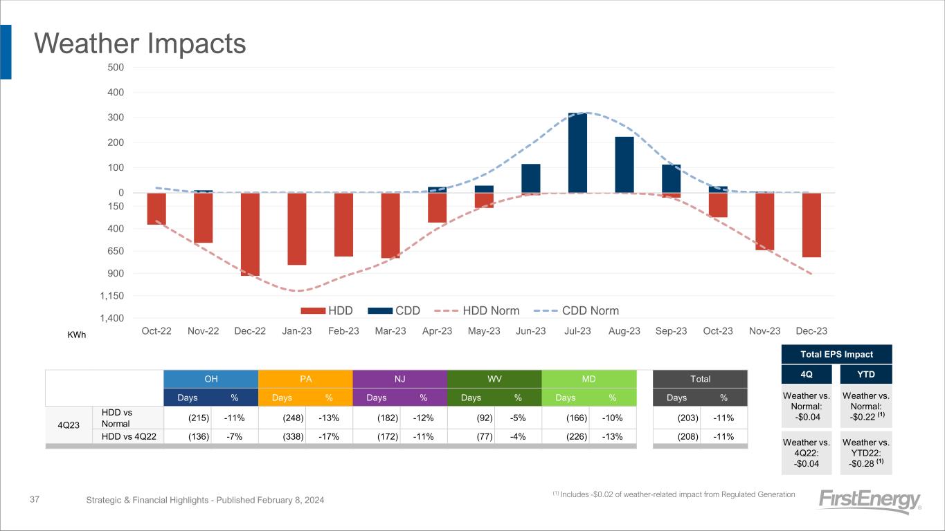 Weather Impacts Strategic & Financial Highlights - Published February 8, 2024 0 100 200 300 400 500 1,400 1,150 900 650 400 150 Oct-22 Nov-22 Dec-22 Jan-23 Feb-23 Mar-23 Apr-23 May-23 Jun-23 Jul-23 Aug-23 Sep-23 Oct-23 Nov-23 Dec-23 HDD CDD HDD Norm CDD Norm 37 Total EPS Impact 4Q YTD Weather vs. Normal: -$0.04 Weather vs. Normal: -$0.22 (1) Weather vs. 4Q22: -$0.04 Weather vs. YTD22: -$0.28 (1) (1) Includes -$0.02 of weather-related impact from Regulated Generation Days % Days % Days % Days % Days % Days % HDD vs Normal (215) -11% (248) -13% (182) -12% (92) -5% (166) -10% (203) -11% HDD vs 4Q22 (136) -7% (338) -17% (172) -11% (77) -4% (226) -13% (208) -11% Total 4Q23 OH PA NJ WV MD KWh