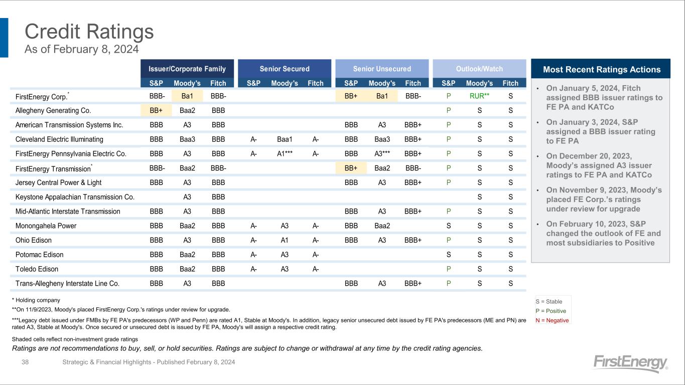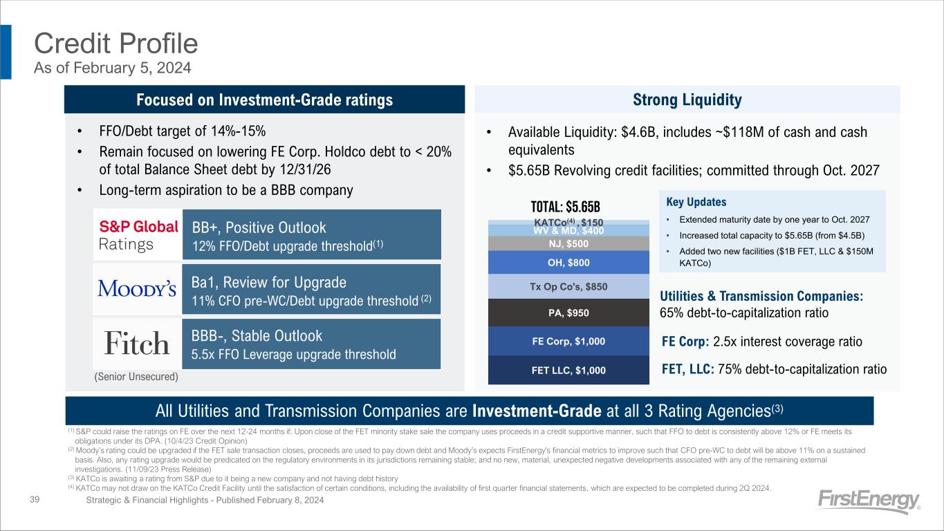 • On January 5, 2024, Fitch assigned BBB issuer ratings to FE PA and KATCo • On January 3, 2024, S&P assigned a BBB issuer rating to FE PA • On December 20, 2023, Moody’s assigned A3 issuer ratings to FE PA and KATCo • On November 9, 2023, Moody’s placed FE Corp.’s ratings under review for upgrade • On February 10, 2023, S&P changed the outlook of FE and most subsidiaries to Positive Credit Ratings As of February 8, 2024 Strategic & Financial Highlights - Published February 8, 2024 Most Recent Ratings Actions 38 * Holding company S = Stable **On 11/9/2023, Moody's placed FirstEnergy Corp.'s ratings under review for upgrade. P = Positive ***Legacy debt issued under FMBs by FE PA's predecessors (WP and Penn) are rated A1, Stable at Moody's. In addition, legacy senior unsecured debt issued by FE PA's predecessors (ME and PN) are rated A3, Stable at Moody's. Once secured or unsecured debt is issued by FE PA, Moody's will assign a respective credit rating. N = Negative Shaded cells reflect non-investment grade ratings Ratings are not recommendations to buy, sell, or hold securities. Ratings are subject to change or withdrawal at any time by the credit rating agencies. S&P Moody's Fitch S&P Moody's Fitch S&P Moody's Fitch S&P Moody's Fitch FirstEnergy Corp.* BBB- Ba1 BBB- BB+ Ba1 BBB- P RUR** S Allegheny Generating Co. BB+ Baa2 BBB P S S American Transmission Systems Inc. BBB A3 BBB BBB A3 BBB+ P S S Cleveland Electric Illuminating BBB Baa3 BBB A- Baa1 A- BBB Baa3 BBB+ P S S FirstEnergy Pennsylvania Electric Co. BBB A3 BBB A- A1*** A- BBB A3*** BBB+ P S S FirstEnergy Transmission* BBB- Baa2 BBB- BB+ Baa2 BBB- P S S Jersey Central Power & Light BBB A3 BBB BBB A3 BBB+ P S S Keystone Appalachian Transmission Co. A3 BBB S S Mid-Atlantic Interstate Transmission BBB A3 BBB BBB A3 BBB+ P S S Monongahela Power BBB Baa2 BBB A- A3 A- BBB Baa2 S S S Ohio Edison BBB A3 BBB A- A1 A- BBB A3 BBB+ P S S Potomac Edison BBB Baa2 BBB A- A3 A- S S S Toledo Edison BBB Baa2 BBB A- A3 A- P S S Trans-Allegheny Interstate Line Co. BBB A3 BBB BBB A3 BBB+ P S S Issuer/Corporate Family Senior Secured Senior Unsecured Outlook/Watch