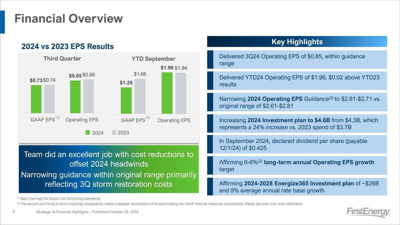 Delivering Financial Results 3Q 2024 Earnings Summary – Segment View Strategic & Financial Highlights – Published October 29, 2024 Note: Reconciliations between GAAP Earnings from Continuing Operations and Operating (non-GAAP) earnings and detailed information is available in the Earnings Supplement section of the Strategic & Financial Highlights Quarter-over-Quarter Operating EPS Walk Dx $0.37 Int $0.28 Tx $0.17 Corp $0.06 Dx $0.39 Int $0.37 Tx $0.13 Corp($0.04) ▪ Distribution +$0.02: impact of higher customer demand ▪ Integrated +$0.09: implementation of new base rates and rate base growth, partially offset by higher storm restoration expenses ▪ Stand-Alone Transmission -$0.04: impact of dilution from FET 30% sale (closed 3/25/24), partially offset by continued rate base growth ▪ Corporate -$0.10: lower income tax benefits and lower planned earnings from Signal Peak, partially offset by impact of debt paydowns 3Q24 GAAP EPS from Continuing Operations: $0.73/sh (vs. $0.74/sh in 3Q23) 3Q24 Operating EPS: $0.85/sh (vs. $0.88/sh in 3Q23) Rates & Investments +$0.01 Ohio ESP -$0.02 Customer Demand +$0.02 All Other +$0.01 Rates & Investments +$0.02 Dilution from FET 30% Sale -$0.06 All Other -$0.13 (incl. Income Taxes -$0.09, Signal Peak -$0.03) Financing Costs +$0.03 Rates & Investments +$0.09 Customer Demand +$0.01 Operating Expenses -$0.02 Financing Costs +$0.01 Signal Peak (~$0.06 3Q23 vs. $0.03 in 3Q24) New rates & investments drove sustainable earnings growth, which was offset by higher storm restoration costs and the absence of 3Q23 income tax benefits 9