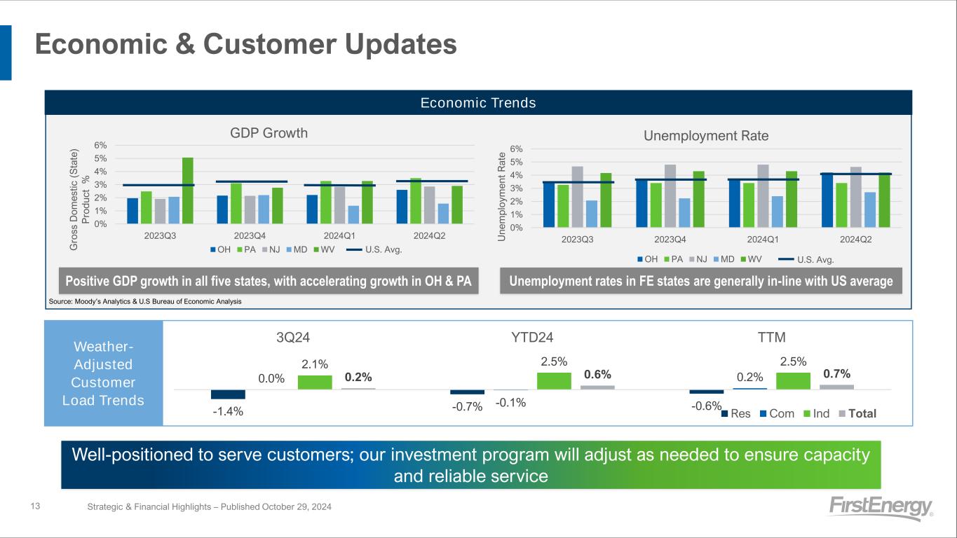 Economic & Customer Updates Strategic & Financial Highlights – Published October 29, 2024 Economic Trends Source: Moody’s Analytics & U.S Bureau of Economic Analysis 0% 1% 2% 3% 4% 5% 6% 2023Q3 2023Q4 2024Q1 2024Q2U n e m p lo y m e n t R a te Unemployment Rate OH PA NJ MD WV 0% 1% 2% 3% 4% 5% 6% 2023Q3 2023Q4 2024Q1 2024Q2 G ro s s D o m e s ti c ( S ta te ) P ro d u c t % GDP Growth OH PA NJ MD WV U.S. Avg. U.S. Avg. Positive GDP growth in all five states, with accelerating growth in OH & PA Unemployment rates in FE states are generally in-line with US average Well-positioned to serve customers; our investment program will adjust as needed to ensure capacity and reliable service Weather- Adjusted Customer Load Trends -1.4% -0.7% -0.6% 0.0% -0.1% 0.2% 2.1% 2.5% 2.5% 0.2% 0.6% 0.7% 3Q24 YTD24 TTM Res Com Ind Total 13
