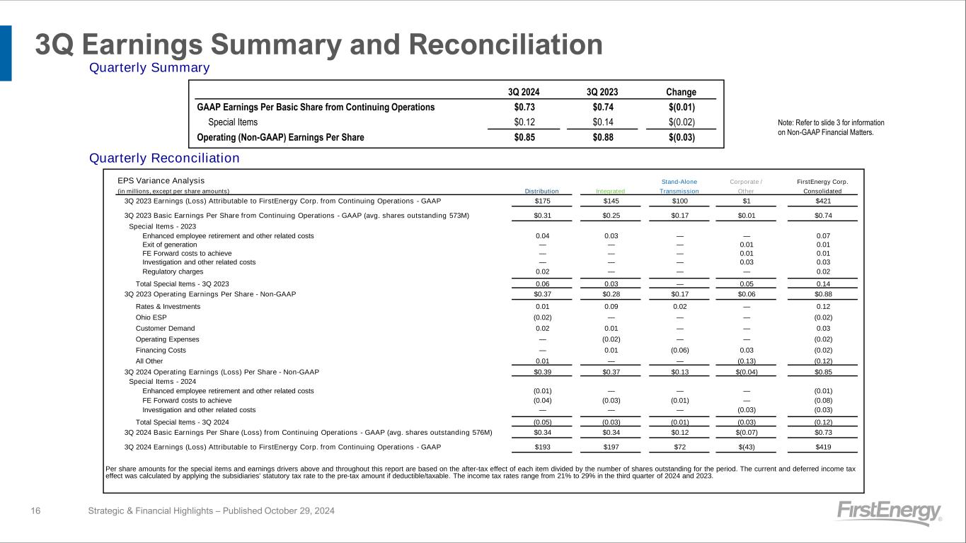 3Q Earnings Summary and Reconciliation Strategic & Financial Highlights – Published October 29, 2024 EPS Variance Analysis Stand-Alone Corporate / FirstEnergy Corp. (in millions, except per share amounts) Distribution Integrated Transmission Other Consolidated 3Q 2023 Earnings (Loss) Attributable to FirstEnergy Corp. from Continuing Operations - GAAP $175 $145 $100 $1 $421 3Q 2023 Basic Earnings Per Share from Continuing Operations - GAAP (avg. shares outstanding 573M) $0.31 $0.25 $0.17 $0.01 $0.74 Special Items - 2023 Enhanced employee retirement and other related costs 0.04 0.03 — — 0.07 Exit of generation — — — 0.01 0.01 FE Forward costs to achieve — — — 0.01 0.01 Investigation and other related costs — — — 0.03 0.03 Regulatory charges 0.02 — — — 0.02 Total Special Items - 3Q 2023 0.06 0.03 — 0.05 0.14 3Q 2023 Operating Earnings Per Share - Non-GAAP $0.37 $0.28 $0.17 $0.06 $0.88 Rates & Investments 0.01 0.09 0.02 — 0.12 Ohio ESP (0.02) — — — (0.02) Customer Demand 0.02 0.01 — — 0.03 Operating Expenses — (0.02) — — (0.02) Financing Costs — 0.01 (0.06) 0.03 (0.02) All Other 0.01 — — (0.13) (0.12) 3Q 2024 Operating Earnings (Loss) Per Share - Non-GAAP $0.39 $0.37 $0.13 $(0.04) $0.85 Special Items - 2024 Enhanced employee retirement and other related costs (0.01) — — — (0.01) FE Forward costs to achieve (0.04) (0.03) (0.01) — (0.08) Investigation and other related costs — — — (0.03) (0.03) Total Special Items - 3Q 2024 (0.05) (0.03) (0.01) (0.03) (0.12) 3Q 2024 Basic Earnings Per Share (Loss) from Continuing Operations - GAAP (avg. shares outstanding 576M) $0.34 $0.34 $0.12 $(0.07) $0.73 3Q 2024 Earnings (Loss) Attributable to FirstEnergy Corp. from Continuing Operations - GAAP $193 $197 $72 $(43) $419 Per share amounts for the special items and earnings drivers above and throughout this report are based on the after-tax effect of each item divided by the number of shares outstanding for the period. The current and deferred income tax effect was calculated by applying the subsidiaries' statutory tax rate to the pre-tax amount if deductible/taxable. The income tax rates range from 21% to 29% in the third quarter of 2024 and 2023. Quarterly Summary Quarterly Reconciliation 3Q 2024 3Q 2023 Change GAAP Earnings Per Basic Share from Continuing Operations $0.73 $0.74 $(0.01) Special Items $0.12 $0.14 $(0.02) Operating (Non-GAAP) Earnings Per Share $0.85 $0.88 $(0.03) Note: Refer to slide 3 for information on Non-GAAP Financial Matters. 16