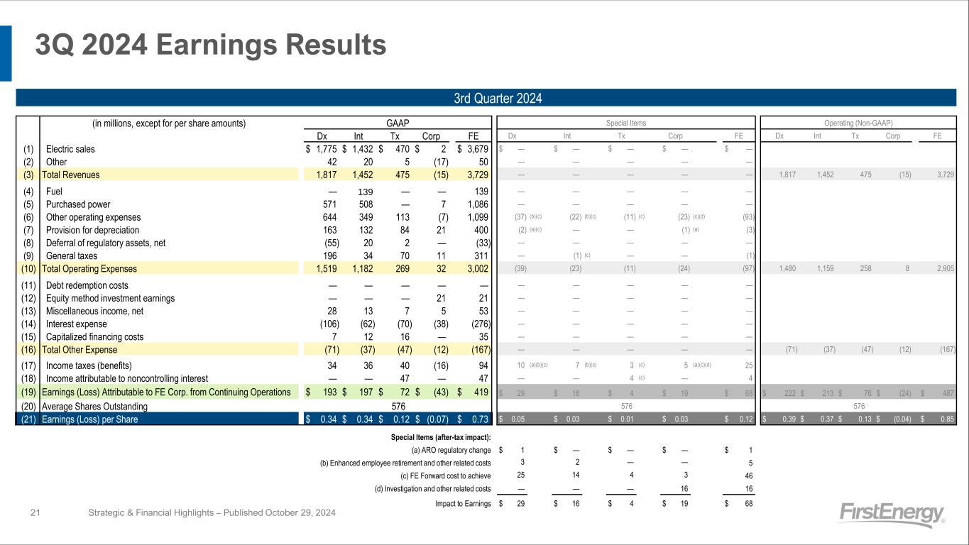 3Q 2024 Earnings Results Strategic & Financial Highlights – Published October 29, 2024 3rd Quarter 2024 (in millions, except for per share amounts) GAAP Special Items Operating (Non-GAAP) Dx Int Tx Corp FE Dx Int Tx Corp FE Dx Int Tx Corp FE (1) Electric sales $ 1,775 $ 1,432 $ 470 $ 2 $ 3,679 $ — $ — $ — $ — $ — $ 1,775 $ 1,432 $ 470 $ 2 $ 3,679 (2) Other 42 20 5 (17) 50 — — — — — 42 20 5 (17) 50 (3) Total Revenues 1,817 1,452 475 (15) 3,729 — — — — — 1,817 1,452 475 (15) 3,729 (4) Fuel — 139 — — 139 — — — — — — 139 — — 139 (5) Purchased power 571 508 — 7 1,086 — — — — — 571 508 — 7 1,086 (6) Other operating expenses 644 349 113 (7) 1,099 (37) (b)(c) (22) (b)(c) (11) (c) (23) (c)(d) (93) 607 327 102 (30) 1,006 (7) Provision for depreciation 163 132 84 21 400 (2) (a)(c) — — (1) (a) (3) 161 132 84 20 397 (8) Deferral of regulatory assets, net (55) 20 2 — (33) — — — — — (55) 20 2 — (33) (9) General taxes 196 34 70 11 311 — (1) (c) — — (1) 196 33 70 11 310 (10) Total Operating Expenses 1,519 1,182 269 32 3,002 (39) (23) (11) (24) (97) 1,480 1,159 258 8 2,905 (11) Debt redemption costs — — — — — — — — — — — — — — — (12) Equity method investment earnings — — — 21 21 — — — — — — — — 21 21 (13) Miscellaneous income, net 28 13 7 5 53 — — — — — 28 13 7 5 53 (14) Interest expense (106) (62) (70) (38) (276) — — — — — (106) (62) (70) (38) (276) (15) Capitalized financing costs 7 12 16 — 35 — — — — — 7 12 16 — 35 (16) Total Other Expense (71) (37) (47) (12) (167) — — — — — (71) (37) (47) (12) (167) (17) Income taxes (benefits) 34 36 40 (16) 94 10 (a)(b)(c) 7 (b)(c) 3 (c) 5 (a)(c)(d) 25 44 43 43 (11) 119 (18) Income attributable to noncontrolling interest — — 47 — 47 — — 4 (c) — 4 — — 51 — 51 (19) Earnings (Loss) Attributable to FE Corp. from Continuing Operations $ 193 $ 197 $ 72 $ (43) $ 419 $ 29 $ 16 $ 4 $ 19 $ 68 $ 222 $ 213 $ 76 $ (24) $ 487 (20) Average Shares Outstanding 576 576 576 (21) Earnings (Loss) per Share $ 0.34 $ 0.34 $ 0.12 $ (0.07) $ 0.73 $ 0.05 $ 0.03 $ 0.01 $ 0.03 $ 0.12 $ 0.39 $ 0.37 $ 0.13 $ (0.04) $ 0.85 Special Items (after-tax impact): (a) (a) ARO regulatory change $ 1 $ — $ — $ — $ 1 (b) (b) Enhanced employee retirement and other related costs 3 2 — — 5 (c) (c) FE Forward cost to achieve 25 14 4 3 46 (d) (d) Investigation and other related costs — — — 16 16 Impact to Earnings $ 29 $ 16 $ 4 $ 19 $ 68 21