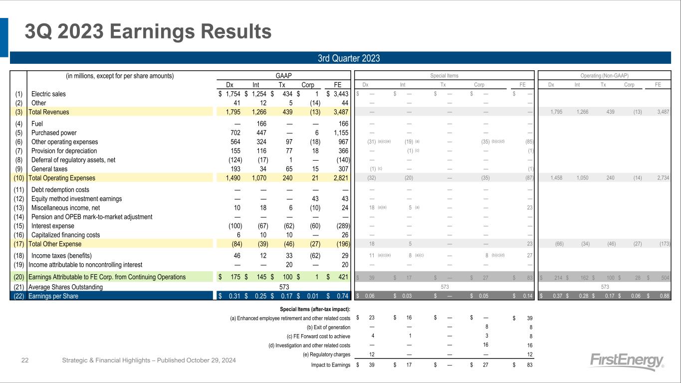 3Q 2023 Earnings Results Strategic & Financial Highlights – Published October 29, 2024 3rd Quarter 2023 (in millions, except for per share amounts) GAAP Special Items Operating (Non-GAAP) Dx Int Tx Corp FE Dx Int Tx Corp FE Dx Int Tx Corp FE (1) Electric sales $ 1,754 $ 1,254 $ 434 $ 1 $ 3,443 $ — $ — $ — $ — $ — $ 1,754 $ 1,254 $ 434 $ 1 $ 3,443 (2) Other 41 12 5 (14) 44 — — — — — 41 12 5 (14) 44 (3) Total Revenues 1,795 1,266 439 (13) 3,487 — — — — — 1,795 1,266 439 (13) 3,487 (4) Fuel — 166 — — 166 — — — — — — 166 — — 166 (5) Purchased power 702 447 — 6 1,155 — — — — — 702 447 — 6 1,155 (6) Other operating expenses 564 324 97 (18) 967 (31) (a)(c)(e) (19) (a) — (35) (b)(c)(d) (85) 533 305 97 (53) 882 (7) Provision for depreciation 155 116 77 18 366 — (1) (c) — — (1) 155 115 77 18 365 (8) Deferral of regulatory assets, net (124) (17) 1 — (140) — — — — — (124) (17) 1 — (140) (9) General taxes 193 34 65 15 307 (1) (c) — — — (1) 192 34 65 15 306 (10) Total Operating Expenses 1,490 1,070 240 21 2,821 (32) (20) — (35) (87) 1,458 1,050 240 (14) 2,734 (11) Debt redemption costs — — — — — — — — — — — — — — — (12) Equity method investment earnings — — — 43 43 — — — — — — — — 43 43 (13) Miscellaneous income, net 10 18 6 (10) 24 18 (a)(e) 5 (a) — — 23 28 23 6 (10) 47 (14) Pension and OPEB mark-to-market adjustment — — — — — — — — — — — — — — — (15) Interest expense (100) (67) (62) (60) (289) — — — — — (100) (67) (62) (60) (289) (16) Capitalized financing costs 6 10 10 — 26 — — — — — 6 10 10 — 26 (17) Total Other Expense (84) (39) (46) (27) (196) 18 5 — — 23 (66) (34) (46) (27) (173) (18) Income taxes (benefits) 46 12 33 (62) 29 11 (a)(c)(e) 8 (a)(c) — 8 (b)(c)(d) 27 57 20 33 (54) 56 (19) Income attributable to noncontrolling interest — — 20 — 20 — — — — — — — 20 — 20 (20) Earnings Attributable to FE Corp. from Continuing Operations $ 175 $ 145 $ 100 $ 1 $ 421 $ 39 $ 17 $ — $ 27 $ 83 $ 214 $ 162 $ 100 $ 28 $ 504 (21) Average Shares Outstanding 573 573 573 (22) Earnings per Share $ 0.31 $ 0.25 $ 0.17 $ 0.01 $ 0.74 $ 0.06 $ 0.03 $ — $ 0.05 $ 0.14 $ 0.37 $ 0.28 $ 0.17 $ 0.06 $ 0.88 Special Items (after-tax impact): (a) (a) Enhanced employee retirement and other related costs $ 23 $ 16 $ — $ — $ 39 (b) (b) Exit of generation — — — 8 8 (c) (c) FE Forward cost to achieve 4 1 — 3 8 (d) (d) Investigation and other related costs — — — 16 16 (e) (e) Regulatory charges 12 — — — 12 Impact to Earnings $ 39 $ 17 $ — $ 27 $ 83 22