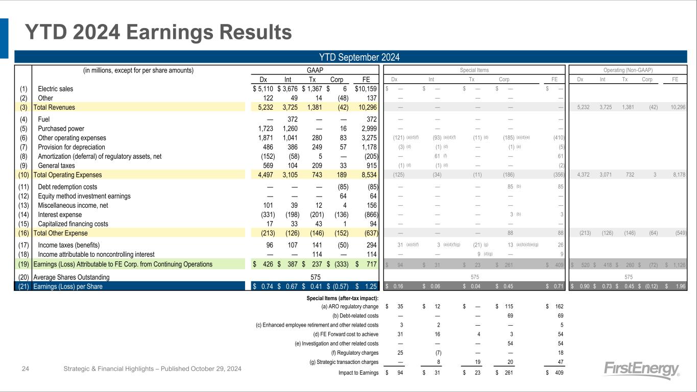 YTD 2024 Earnings Results Strategic & Financial Highlights – Published October 29, 2024 YTD September 2024 (in millions, except for per share amounts) GAAP Special Items Operating (Non-GAAP) Dx Int Tx Corp FE Dx Int Tx Corp FE Dx Int Tx Corp FE (1) Electric sales $ 5,110 $ 3,676 $ 1,367 $ 6 $10,159 $ — $ — $ — $ — $ — $ 5,110 $ 3,676 $ 1,367 $ 6 $ 10,159 (2) Other 122 49 14 (48) 137 — — — — — 122 49 14 (48) 137 (3) Total Revenues 5,232 3,725 1,381 (42) 10,296 — — — — — 5,232 3,725 1,381 (42) 10,296 (4) Fuel — 372 — — 372 — — — — — — 372 — — 372 (5) Purchased power 1,723 1,260 — 16 2,999 — — — — — 1,723 1,260 — 16 2,999 (6) Other operating expenses 1,871 1,041 280 83 3,275 (121) (a)(d)(f) (93) (a)(d)(f) (11) (d) (185) (a)(d)(e) (410) 1,750 948 269 (102) 2,865 (7) Provision for depreciation 486 386 249 57 1,178 (3) (d) (1) (d) — (1) (a) (5) 483 385 249 56 1,173 (8) Amortization (deferral) of regulatory assets, net (152) (58) 5 — (205) — 61 (f) — — 61 (152) 3 5 — (144) (9) General taxes 569 104 209 33 915 (1) (d) (1) (d) — — (2) 568 103 209 33 913 (10) Total Operating Expenses 4,497 3,105 743 189 8,534 (125) (34) (11) (186) (356) 4,372 3,071 732 3 8,178 (11) Debt redemption costs — — — (85) (85) — — — 85 (b) 85 — — — — — (12) Equity method investment earnings — — — 64 64 — — — — — — — — 64 64 (13) Miscellaneous income, net 101 39 12 4 156 — — — — — 101 39 12 4 156 (14) Interest expense (331) (198) (201) (136) (866) — — — 3 (b) 3 (331) (198) (201) (133) (863) (15) Capitalized financing costs 17 33 43 1 94 — — — — — 17 33 43 1 94 (16) Total Other Expense (213) (126) (146) (152) (637) — — — 88 88 (213) (126) (146) (64) (549) (17) Income taxes (benefits) 96 107 141 (50) 294 31 (a)(d)(f) 3 (a)(d)(f)(g) (21) (g) 13 (a)(b)(d)(e)(g) 26 127 110 120 (37) 320 (18) Income attributable to noncontrolling interest — — 114 — 114 — — 9 (d)(g) — 9 — — 123 — 123 (19) Earnings (Loss) Attributable to FE Corp. from Continuing Operations $ 426 $ 387 $ 237 $ (333) $ 717 $ 94 $ 31 $ 23 $ 261 $ 409 $ 520 $ 418 $ 260 $ (72) $ 1,126 (20) Average Shares Outstanding 575 575 575 (21) Earnings (Loss) per Share $ 0.74 $ 0.67 $ 0.41 $ (0.57) $ 1.25 $ 0.16 $ 0.06 $ 0.04 $ 0.45 $ 0.71 $ 0.90 $ 0.73 $ 0.45 $ (0.12) $ 1.96 Special Items (after-tax impact): (a) (a) ARO regulatory change $ 35 $ 12 $ — $ 115 $ 162 (b) (b) Debt-related costs — — — 69 69 (c) (c) Enhanced employee retirement and other related costs 3 2 — — 5 (d) (d) FE Forward cost to achieve 31 16 4 3 54 (e) (e) Investigation and other related costs — — — 54 54 (f) (f) Regulatory charges 25 (7) — — 18 (g) (g) Strategic transaction charges — 8 19 20 47 Impact to Earnings $ 94 $ 31 $ 23 $ 261 $ 409 24