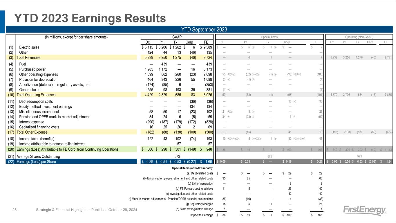 YTD 2023 Earnings Results Strategic & Financial Highlights – Published October 29, 2024 YTD September 2023 (in millions, except for per share amounts) GAAP Special Items Operating (Non-GAAP) Dx Int Tx Corp FE Dx Int Tx Corp FE Dx Int Tx Corp FE (1) Electric sales $ 5,115 $ 3,206 $ 1,262 $ 6 $ 9,589 $ — $ 6 (g) $ 1 (g) $ — $ 7 $ 5,115 $ 3,212 $ 1,263 $ 6 $ 9,596 (2) Other 124 44 13 (46) 135 — — — — — 124 44 13 (46) 135 (3) Total Revenues 5,239 3,250 1,275 (40) 9,724 — 6 1 — 7 5,239 3,256 1,276 (40) 9,731 (4) Fuel — 439 — — 439 — — — — — — 439 — — 439 (5) Purchased power 1,985 1,172 — 16 3,173 — — — — — 1,985 1,172 — 16 3,173 (6) Other operating expenses 1,599 862 260 (23) 2,698 (55) (b)(d)(g) (32) (b)(d)(g) (1) (g) (98) (c)(d)(e) (186) 1,544 830 259 (121) 2,512 (7) Provision for depreciation 464 343 226 55 1,088 (3) (d) (1) (d) — — (4) 461 342 226 55 1,084 (8) Amortization (deferral) of regulatory assets, net (174) (85) 6 — (253) — — — — — (174) (85) 6 — (253) (9) General taxes 555 98 193 35 881 (1) (d) — — — (1) 554 98 193 35 880 (10) Total Operating Expenses 4,429 2,829 685 83 8,026 (59) (33) (1) (98) (191) 4,370 2,796 684 (15) 7,835 (11) Debt redemption costs — — — (36) (36) — — — 36 (a) 36 — — — — — (12) Equity method investment earnings — — — 134 134 — — — — — — — — 134 134 (13) Miscellaneous income, net 58 50 17 (23) 102 21 (b)(g) 8 (b) — — 29 79 58 17 (23) 131 (14) Pension and OPEB mark-to-market adjustment 34 24 6 (5) 59 (34) (f) (23) (f) — 5 (f) (52) — 1 6 — 7 (15) Interest expense (290) (187) (179) (172) (828) — — — — — (290) (187) (179) (172) (828) (16) Capitalized financing costs 16 25 26 2 69 — — — — — 16 25 26 2 69 (17) Total Other Expense (182) (88) (130) (100) (500) (13) (15) — 41 13 (195) (103) (130) (59) (487) (18) Income taxes (benefits) 122 43 102 (74) 193 10 (b)(d)(f)(g)(h) 5 (b)(d)(f)(g) 1 (g) 30 (a)(c)(d)(e)(f) 46 132 48 103 (44) 239 (19) Income attributable to noncontrolling interest — — 57 — 57 — — — — — — — 57 — 57 (20) Earnings (Loss) Attributable to FE Corp. from Continuing Operations $ 506 $ 290 $ 301 $ (149) $ 948 $ 36 $ 19 $ 1 $ 109 $ 165 $ 542 $ 309 $ 302 $ (40) $ 1,113 (21) Average Shares Outstanding 573 573 573 (22) Earnings (Loss) per Share $ 0.89 $ 0.51 $ 0.53 $ (0.27) $ 1.66 $ 0.06 $ 0.03 $ — $ 0.19 $ 0.28 $ 0.95 $ 0.54 $ 0.53 $ (0.08) $ 1.94 Special Items (after-tax impact): (a) (a) Debt-related costs $ — $ — $ — $ 29 $ 29 (b) (b) Enhanced employee retirement and other related costs 35 25 — — 60 (c) (c) Exit of generation — — — 8 8 (d) (d) FE Forward cost to achieve 11 5 — 26 42 (e) (e) Investigation and other related costs — — — 42 42 (f) (f) Mark-to-market adjustments - Pension/OPEB actuarial assumptions (26) (16) — 4 (38) (g) (g) Regulatory charges 15 5 1 — 21 (h) (h) State tax legislative change 1 — — — 1 Impact to Earnings $ 36 $ 19 $ 1 $ 109 $ 165 25