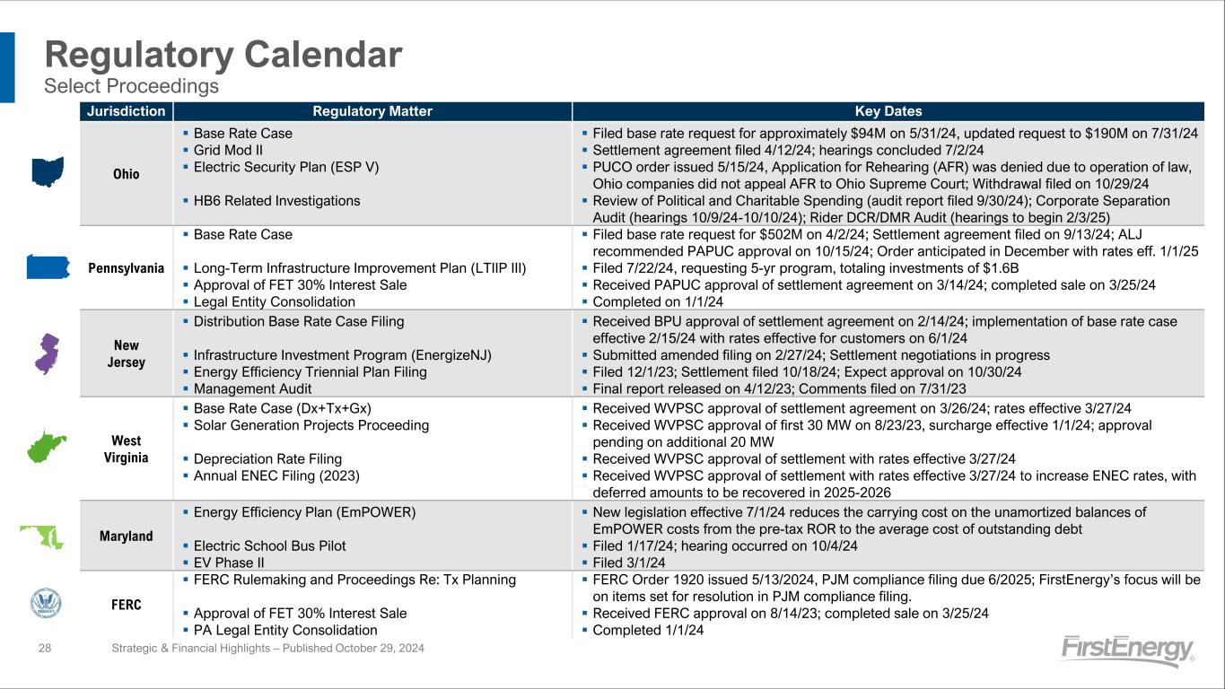Recent Regulatory Activity - OH Strategic & Financial Highlights – Published October 29, 2024 ESP V: Withdrawal filed 10/29/24 ▪ The withdrawal is subject to PUCO order and will result in the Ohio Companies reverting to ESP IV until an ESP VI is filed and approved ▪ Reverting to ESP IV allows us to avoid uncertainty in ESP V with respect to certain conditions, work to get clarity on key ESP rider provisions, and ensure that rider programs are addressed in the appropriate forum of an ESP ▪ Expect to file the ESP VI by early next year and better align the review of ESP VI with the review of our Ohio base rate case Ohio Additional ESP Background May 15: PUCO issued Order to approve our ESP V with modifications, with rates effective June 1, 2025 June 14: FE filed Application for Rehearing (AFR) August 27: Ohio Supreme Court decision (Application of Moraine Wind, LLC), stating that PUCO must decide an AFR within 30 days which thus meant FE’s AFR was denied by operation of law Ohio Political and Charitable Spend Audit: ▪ Audit report filed 9/30/24; confirmed that customers’ rates were impacted by ~$15k of HB6-related political and charitable spending, and FE agreed to provide refunds with interest ▪ Comments filed 10/22 and replies due 11/5 Corporate Separation Audit: ▪ Evidentiary hearings held in October ▪ Initial briefs 11/15, reply briefs 12/13 12