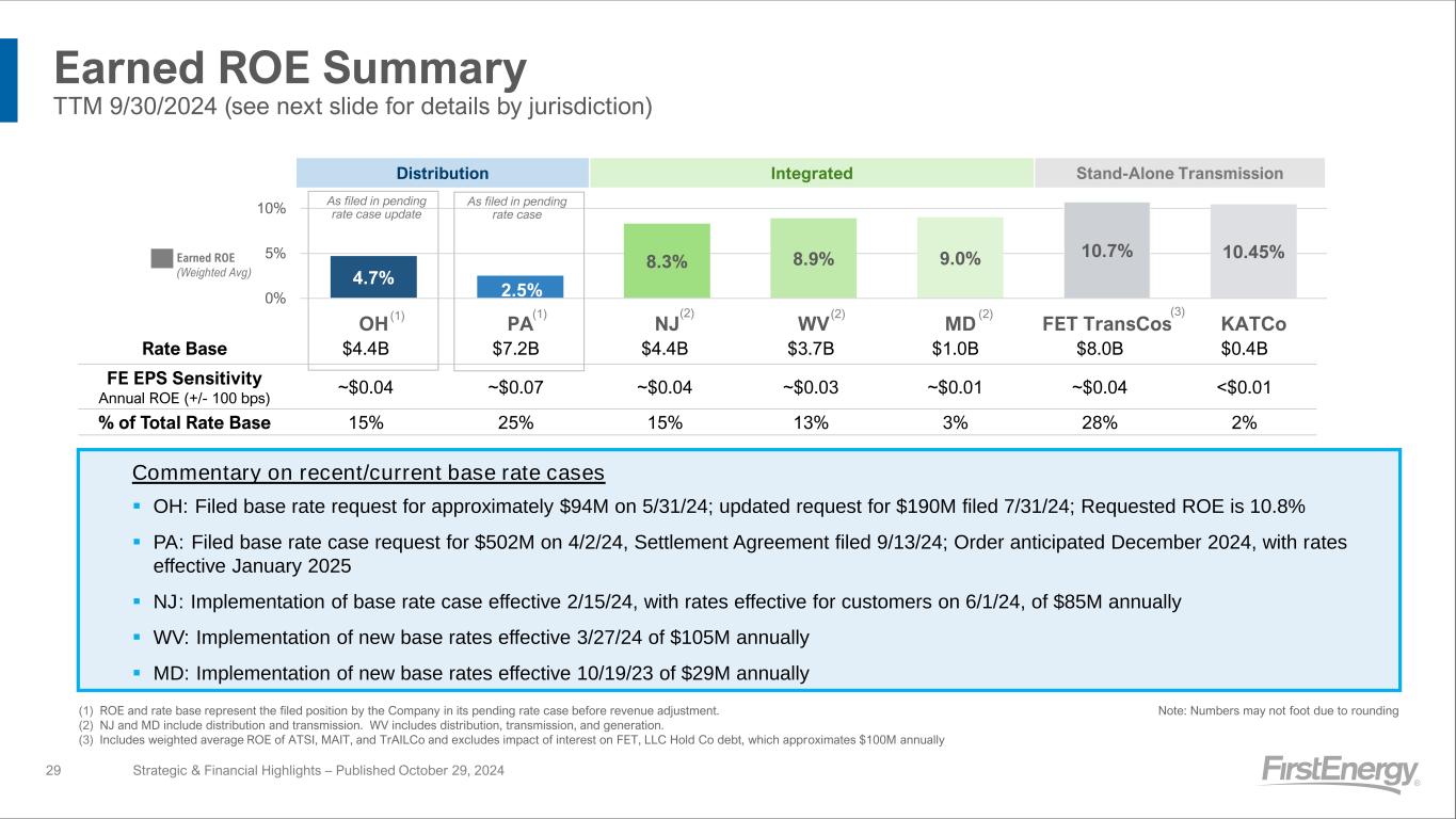 Earned ROE Detail by Jurisdiction TTM 9/30/2024 (1) For distribution assets, represents rate base at the end of the quarter for OH, PA, NJ and 13-month average for WV and MD. For FERC-regulated transmission assets, represents quarter-end rate base balance.. (2) Calculated using filed capital structure for OH & PA, authorized for NJ, WV & MD (3) Actual revenue, not weather normalized; Income taxes calculated using statutory rates or consistent with practice used in base rate case filing (4) Includes PE-VA transmission assets Test Year Allowed ROE Earned ROE Rate Base(1) Equity %(2) Notes & Key Regulatory Adjustments(3) Distribution OH Dx 2024 (proj.) 10.8% (filed) 4.7% (filed) $4.4B (filed) 55% (filed) ▪ See Regulatory Corner for key filing parameters and adjustments ▪ Reflects update filing (5A+7F) made 7/31/24 PA Dx 2025 (proj.) 11.3% (filed) 2.5% (filed) $7.2B (filed) 54% (filed) ▪ See Regulatory Corner for key filing parameters and adjustments Integrated NJ Dx June 2023 9.6% 7.9% $3.1B 52% Earned ROEs reflect the following: ▪ Recovery of previously incurred actuarial losses on Pension/OPEB consistent with the calculation of allowed ROEs ▪ Excludes allowance for funds used during construction-equity on Construction Work in Process (excluded from rate base) ▪ Excludes return on Energy Efficiency Programs, collected through Rider RRC Tx Formula 10.20% 9.1% $1.3B 52% WV Dx, Tx, Gx Dec 2022 9.8% 8.9% $3.7B 50% Earned ROEs reflect the following: ▪ Recovery of previously incurred actuarial losses on Pension/OPEB consistent with the calculation of allowed ROEs ▪ Excludes income from investment in Allegheny Generating Company (Bath County pumped storage facility) and Fort Martin Power Station securitized scrubbers ▪ Excludes allowance for funds used during construction-equity on Construction Work in Process (excluded from rate base) MD Dx Dec 2022 9.5% 8.6% $0.8B 53% Earned ROEs reflect the following: ▪ Recovery of previously incurred actuarial losses on Pension/OPEB consistent with the calculation of allowed ROEs ▪ Excludes return/income and carrying costs on programs such as MD’s EmPOWER energy efficiency program Tx(4) Formula 10.45% 10.45% $0.2B 50% Stand-Alone Transmission FET ATSI Formula 10.38% 10.38% $4.1B 60% Earned ROEs reflect the following: ▪ Excludes allowance for funds used during construction-equity on Construction Work in Process (excluded from rate base) MAIT Formula 10.30% 10.30% $2.5B 60% TrAIL Formula 11.70% 11.70% $1.4B 60% KATCo Tx Formula 10.45% 10.45% $0.4B 49% Strategic & Financial Highlights – Published October 29, 202430