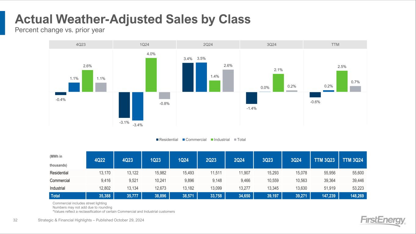 Actual Sales by Class Percent change vs. prior year Commercial includes street lighting Numbers may not add due to rounding *Values reflect a reclassification of certain Commercial and Industrial customers Strategic & Financial Highlights – Published October 29, 2024 (MWh in 4Q22 4Q23 1Q23 1Q24 2Q23 2Q24 3Q23 3Q24 TTM 3Q23 TTM 3Q24 thousands) Residential 13,135 12,486 13,941 14,087 10,836 12,536 14,954 15,415 52,866 54,524 Commercial 9,449 9,291 9,470 9,357 8,946 9,669 10,471 10,680 38,337 38,997 Industrial 12,802 13,134 12,673 13,182 13,099 13,277 13,345 13,630 51,919 53,223 Total 35,386 34,911 36,084 36,626 32,881 35,482 38,770 39,725 143,122 146,744 -4.9% 1.0% 15.7% 3.1% 3.1% -1.7% -1.2% 8.1% 2.0% 1.7% 2.6% 4.0% 1.4% 2.1% 2.5% -1.3% 1.5% 7.9% 2.5% 2.5% 4Q23 1Q24 2Q24 3Q24 TTM Residential Commercial Industrial Total 31