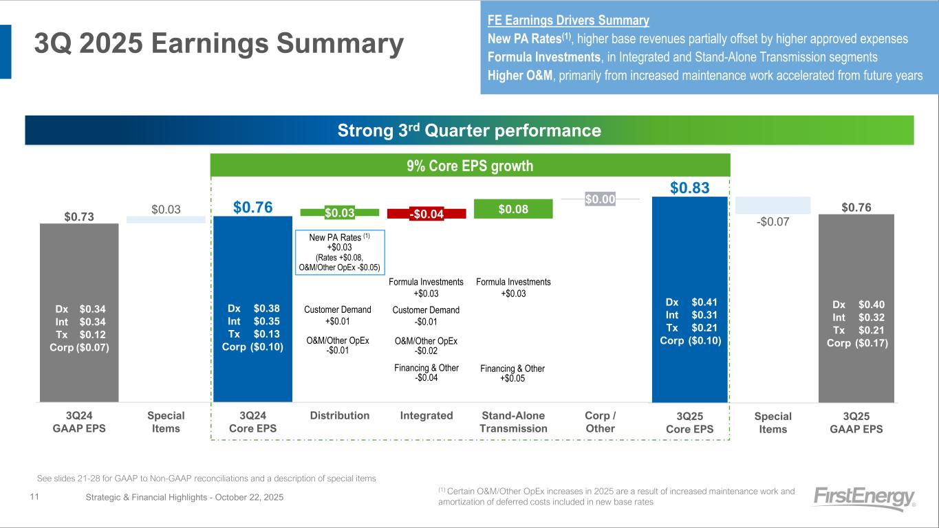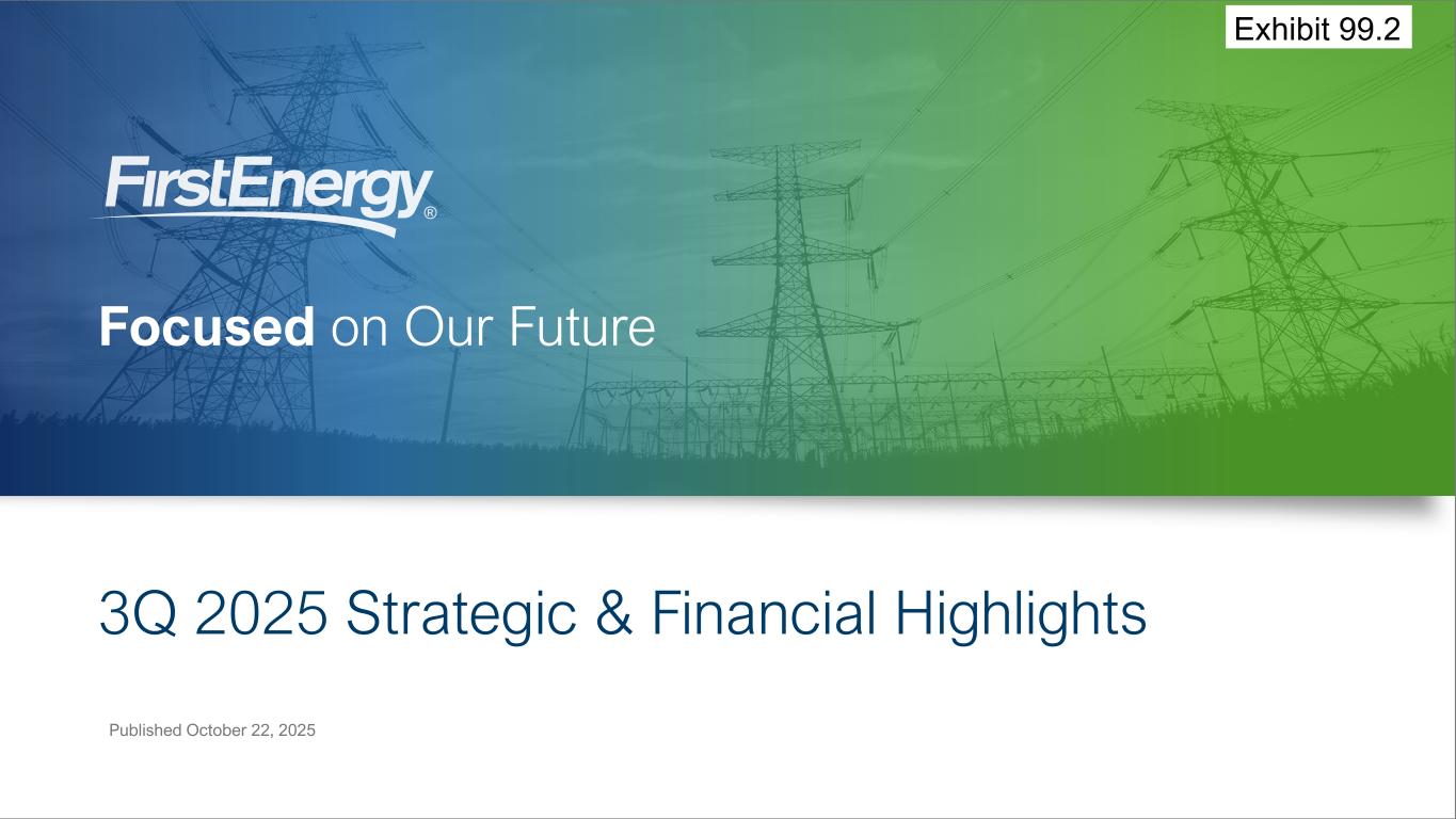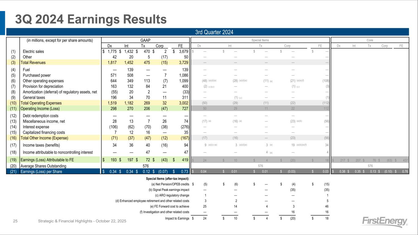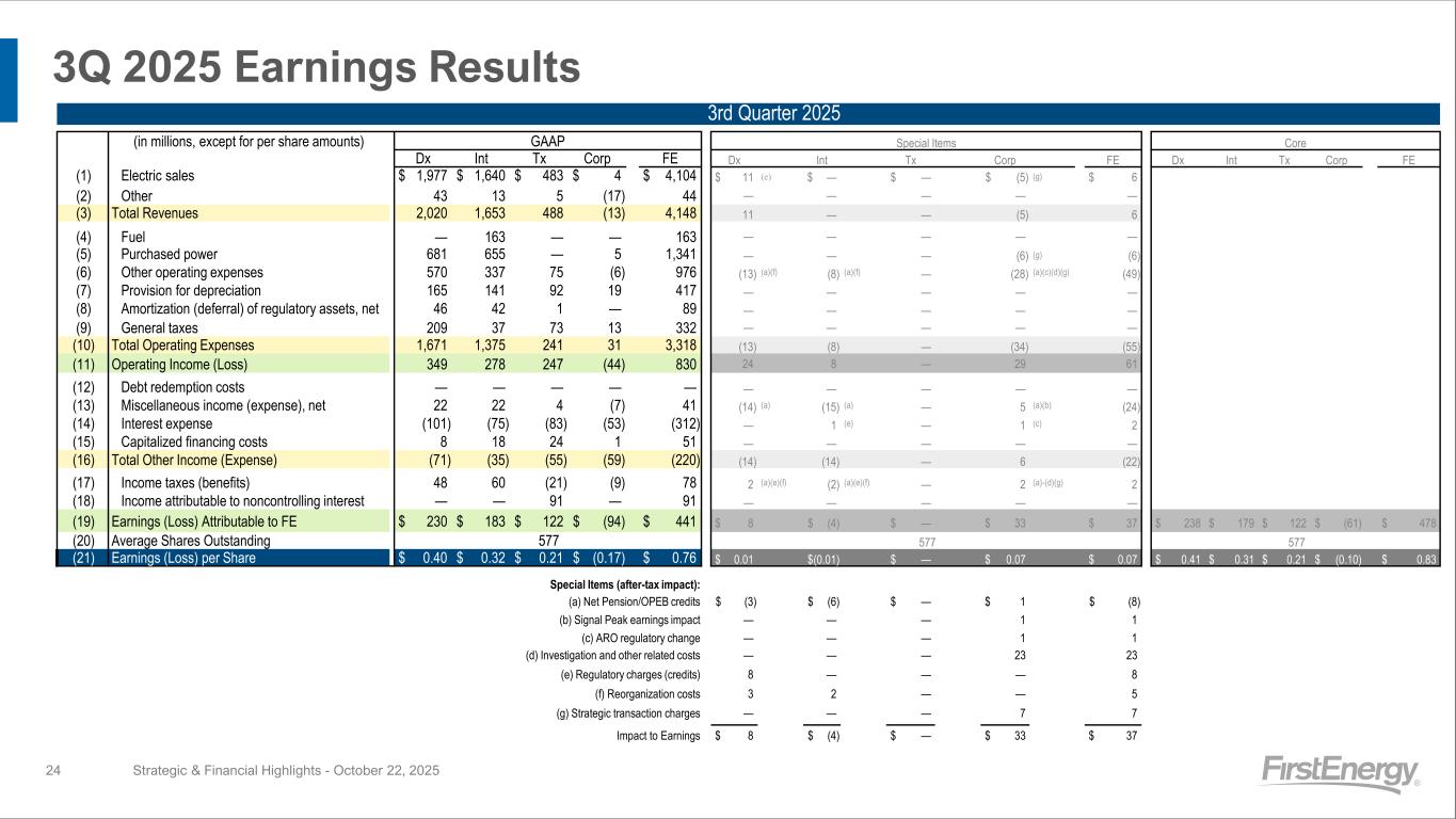 3Q 2025 Earnings Results Strategic & Financial Highlights - October 22, 202524 3rd Quarter 2025 (in millions, except for per share amounts) GAAP Special Items Core Dx Int Tx Corp FE Dx Int Tx Corp FE Dx Int Tx Corp FE (1) Electric sales $ 1,977 $ 1,640 $ 483 $ 4 $ 4,104 $ 11 (e) $ — $ — $ (5) (g) $ 6 (2) Other 43 13 5 (17) 44 — — — — — (3) Total Revenues 2,020 1,653 488 (13) 4,148 11 — — (5) 6 (4) Fuel — 163 — — 163 — — — — — (5) Purchased power 681 655 — 5 1,341 — — — (6) (g) (6) (6) Other operating expenses 570 337 75 (6) 976 (13) (a)(f) (8) (a)(f) — (28) (a)(c)(d)(g) (49) (7) Provision for depreciation 165 141 92 19 417 — — — — — (8) Amortization (deferral) of regulatory assets, net 46 42 1 — 89 — — — — — (9) General taxes 209 37 73 13 332 — — — — — (10) Total Operating Expenses 1,671 1,375 241 31 3,318 (13) (8) — (34) (55) (11) Operating Income (Loss) 349 278 247 (44) 830 24 8 — 29 61 (12) Debt redemption costs — — — — — — — — — — (13) Miscellaneous income (expense), net 22 22 4 (7) 41 (14) (a) (15) (a) — 5 (a)(b) (24) (14) Interest expense (101) (75) (83) (53) (312) — 1 (e) — 1 (c) 2 (15) Capitalized financing costs 8 18 24 1 51 — — — — — (16) Total Other Income (Expense) (71) (35) (55) (59) (220) (14) (14) — 6 (22) (17) Income taxes (benefits) 48 60 (21) (9) 78 2 (a)(e)(f) (2) (a)(e)(f) — 2 (a)-(d)(g) 2 (18) Income attributable to noncontrolling interest — — 91 — 91 — — — — — (19) Earnings (Loss) Attributable to FE $ 230 $ 183 $ 122 $ (94) $ 441 $ 8 $ (4) $ — $ 33 $ 37 $ 238 $ 179 $ 122 $ (61) $ 478 (20) Average Shares Outstanding 577 577 577 (21) Earnings (Loss) per Share $ 0.40 $ 0.32 $ 0.21 $ (0.17) $ 0.76 $ 0.01 $(0.01) $ — $ 0.07 $ 0.07 $ 0.41 $ 0.31 $ 0.21 $ (0.10) $ 0.83 Special Items (after-tax impact): (a) (a) Net Pension/OPEB credits $ (3) $ (6) $ — $ 1 $ (8) (b) (b) Signal Peak earnings impact — — — 1 1 (c) (c) ARO regulatory change — — — 1 1 (d) (d) Investigation and other related costs — — — 23 23 (e) (e) Regulatory charges (credits) 8 — — — 8 (f) (f) Reorganization costs 3 2 — — 5 (g) (g) Strategic transaction charges — — — 7 7 Impact to Earnings $ 8 $ (4) $ — $ 33 $ 37