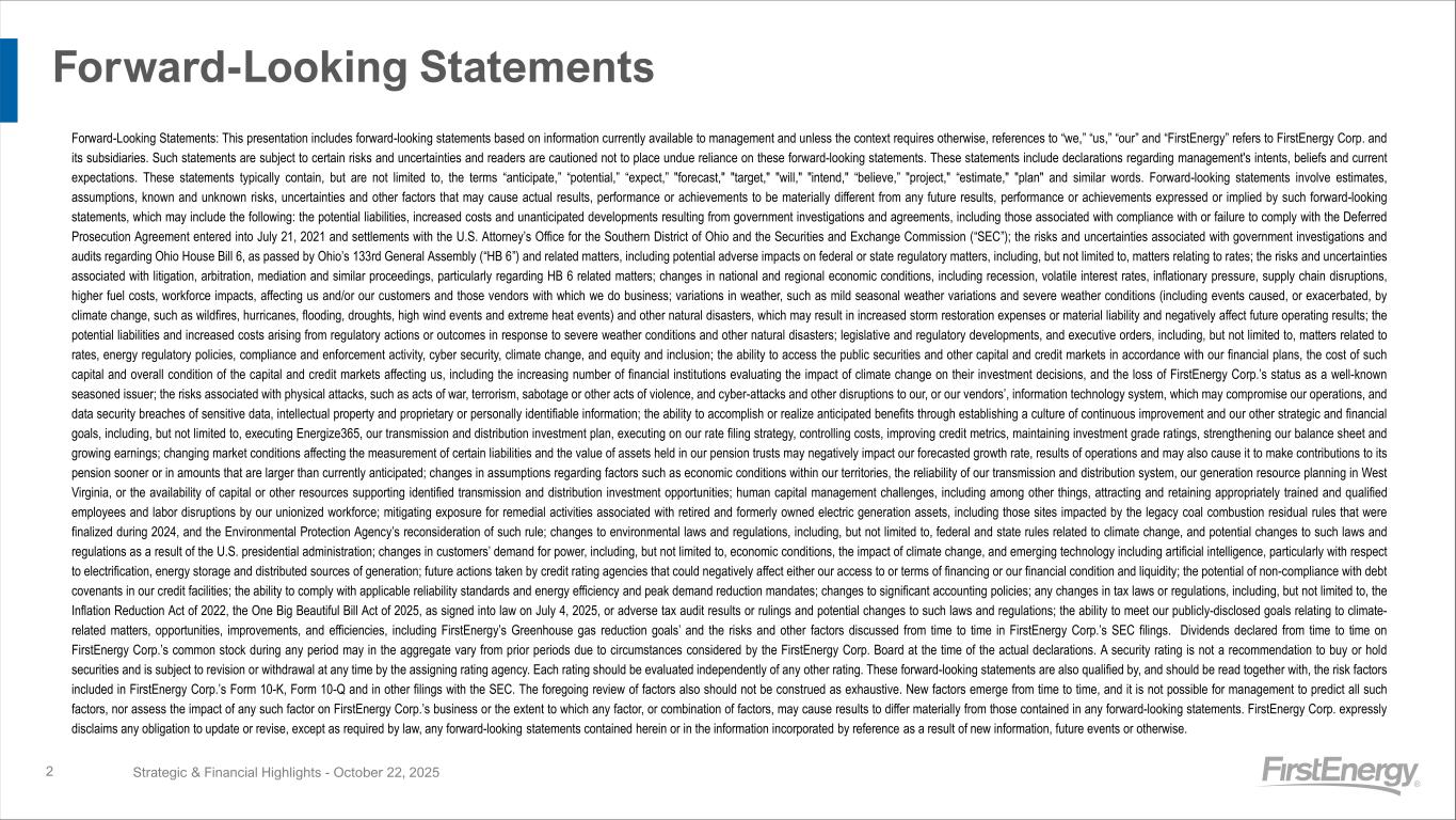 Forward-Looking Statements Forward-Looking Statements: This presentation includes forward-looking statements based on information currently available to management and unless the context requires otherwise, references to “we,” “us,” “our” and “FirstEnergy” refers to FirstEnergy Corp. and its subsidiaries. Such statements are subject to certain risks and uncertainties and readers are cautioned not to place undue reliance on these forward-looking statements. These statements include declarations regarding management's intents, beliefs and current expectations. These statements typically contain, but are not limited to, the terms “anticipate,” “potential,” “expect,” "forecast," "target," "will," "intend," “believe,” "project," “estimate," "plan" and similar words. Forward-looking statements involve estimates, assumptions, known and unknown risks, uncertainties and other factors that may cause actual results, performance or achievements to be materially different from any future results, performance or achievements expressed or implied by such forward-looking statements, which may include the following: the potential liabilities, increased costs and unanticipated developments resulting from government investigations and agreements, including those associated with compliance with or failure to comply with the Deferred Prosecution Agreement entered into July 21, 2021 and settlements with the U.S. Attorney’s Office for the Southern District of Ohio and the Securities and Exchange Commission (“SEC”); the risks and uncertainties associated with government investigations and audits regarding Ohio House Bill 6, as passed by Ohio’s 133rd General Assembly (“HB 6”) and related matters, including potential adverse impacts on federal or state regulatory matters, including, but not limited to, matters relating to rates; the risks and uncertainties associated with litigation, arbitration, mediation and similar proceedings, particularly regarding HB 6 related matters; changes in national and regional economic conditions, including recession, volatile interest rates, inflationary pressure, supply chain disruptions, higher fuel costs, workforce impacts, affecting us and/or our customers and those vendors with which we do business; variations in weather, such as mild seasonal weather variations and severe weather conditions (including events caused, or exacerbated, by climate change, such as wildfires, hurricanes, flooding, droughts, high wind events and extreme heat events) and other natural disasters, which may result in increased storm restoration expenses or material liability and negatively affect future operating results; the potential liabilities and increased costs arising from regulatory actions or outcomes in response to severe weather conditions and other natural disasters; legislative and regulatory developments, and executive orders, including, but not limited to, matters related to rates, energy regulatory policies, compliance and enforcement activity, cyber security, climate change, and equity and inclusion; the ability to access the public securities and other capital and credit markets in accordance with our financial plans, the cost of such capital and overall condition of the capital and credit markets affecting us, including the increasing number of financial institutions evaluating the impact of climate change on their investment decisions, and the loss of FirstEnergy Corp.’s status as a well-known seasoned issuer; the risks associated with physical attacks, such as acts of war, terrorism, sabotage or other acts of violence, and cyber-attacks and other disruptions to our, or our vendors’, information technology system, which may compromise our operations, and data security breaches of sensitive data, intellectual property and proprietary or personally identifiable information; the ability to accomplish or realize anticipated benefits through establishing a culture of continuous improvement and our other strategic and financial goals, including, but not limited to, executing Energize365, our transmission and distribution investment plan, executing on our rate filing strategy, controlling costs, improving credit metrics, maintaining investment grade ratings, strengthening our balance sheet and growing earnings; changing market conditions affecting the measurement of certain liabilities and the value of assets held in our pension trusts may negatively impact our forecasted growth rate, results of operations and may also cause it to make contributions to its pension sooner or in amounts that are larger than currently anticipated; changes in assumptions regarding factors such as economic conditions within our territories, the reliability of our transmission and distribution system, our generation resource planning in West Virginia, or the availability of capital or other resources supporting identified transmission and distribution investment opportunities; human capital management challenges, including among other things, attracting and retaining appropriately trained and qualified employees and labor disruptions by our unionized workforce; mitigating exposure for remedial activities associated with retired and formerly owned electric generation assets, including those sites impacted by the legacy coal combustion residual rules that were finalized during 2024, and the Environmental Protection Agency’s reconsideration of such rule; changes to environmental laws and regulations, including, but not limited to, federal and state rules related to climate change, and potential changes to such laws and regulations as a result of the U.S. presidential administration; changes in customers’ demand for power, including, but not limited to, economic conditions, the impact of climate change, and emerging technology including artificial intelligence, particularly with respect to electrification, energy storage and distributed sources of generation; futu