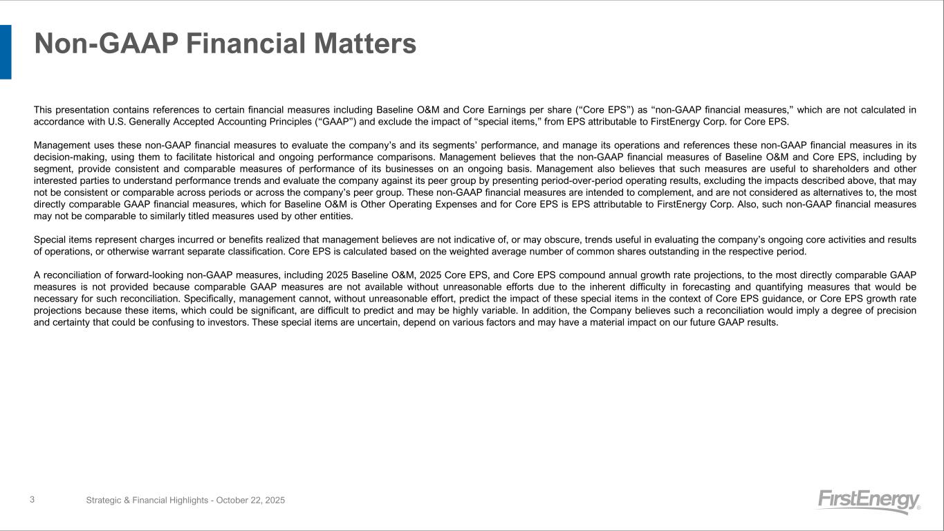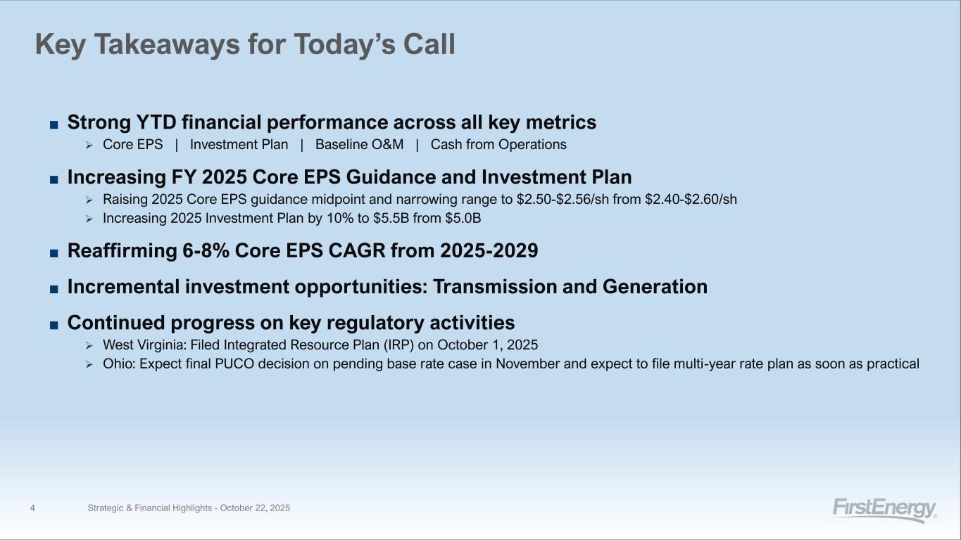 Non-GAAP Financial Matters 3 This presentation contains references to certain financial measures including Baseline O&M and Core Earnings per share (“Core EPS”) as “non-GAAP financial measures,” which are not calculated in accordance with U.S. Generally Accepted Accounting Principles (“GAAP”) and exclude the impact of “special items,” from EPS attributable to FirstEnergy Corp. for Core EPS. Management uses these non-GAAP financial measures to evaluate the company’s and its segments’ performance, and manage its operations and references these non-GAAP financial measures in its decision-making, using them to facilitate historical and ongoing performance comparisons. Management believes that the non-GAAP financial measures of Baseline O&M and Core EPS, including by segment, provide consistent and comparable measures of performance of its businesses on an ongoing basis. Management also believes that such measures are useful to shareholders and other interested parties to understand performance trends and evaluate the company against its peer group by presenting period-over-period operating results, excluding the impacts described above, that may not be consistent or comparable across periods or across the company’s peer group. These non-GAAP financial measures are intended to complement, and are not considered as alternatives to, the most directly comparable GAAP financial measures, which for Baseline O&M is Other Operating Expenses and for Core EPS is EPS attributable to FirstEnergy Corp. Also, such non-GAAP financial measures may not be comparable to similarly titled measures used by other entities. Special items represent charges incurred or benefits realized that management believes are not indicative of, or may obscure, trends useful in evaluating the company’s ongoing core activities and results of operations, or otherwise warrant separate classification. Core EPS is calculated based on the weighted average number of common shares outstanding in the respective period. A reconciliation of forward-looking non-GAAP measures, including 2025 Baseline O&M, 2025 Core EPS, and Core EPS compound annual growth rate projections, to the most directly comparable GAAP measures is not provided because comparable GAAP measures are not available without unreasonable efforts due to the inherent difficulty in forecasting and quantifying measures that would be necessary for such reconciliation. Specifically, management cannot, without unreasonable effort, predict the impact of these special items in the context of Core EPS guidance, or Core EPS growth rate projections because these items, which could be significant, are difficult to predict and may be highly variable. In addition, the Company believes such a reconciliation would imply a degree of precision and certainty that could be confusing to investors. These special items are uncertain, depend on various factors and may have a material impact on our future GAAP results. Strategic & Financial Highlights - October 22, 2025