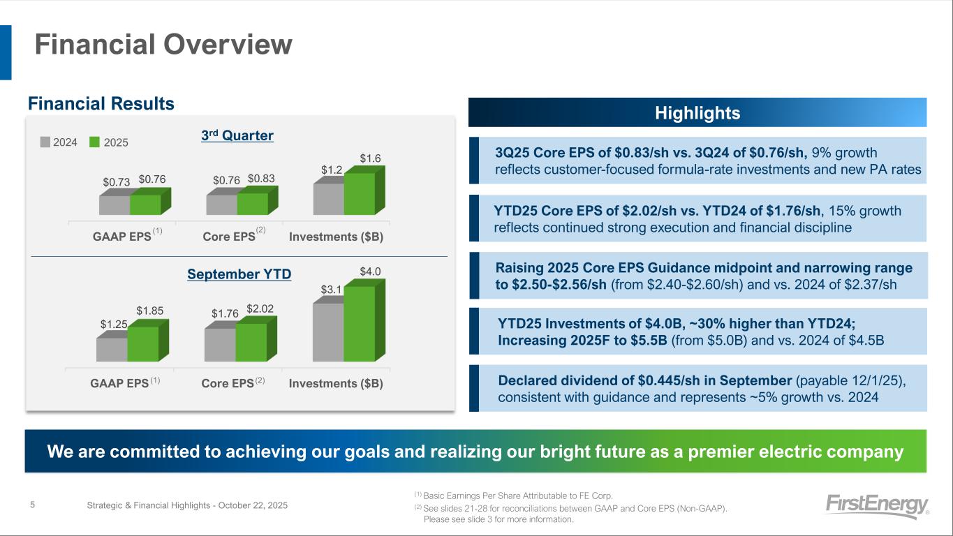 Key Takeaways for Today’s Call Strategic & Financial Highlights - October 22, 20254 ■ Strong YTD financial performance across all key metrics ➢ Core EPS | Investment Plan | Baseline O&M | Cash from Operations ■ Increasing FY 2025 Core EPS Guidance and Investment Plan ➢ Raising 2025 Core EPS guidance midpoint and narrowing range to $2.50-$2.56/sh from $2.40-$2.60/sh ➢ Increasing 2025 Investment Plan by 10% to $5.5B from $5.0B ■ Reaffirming 6-8% Core EPS CAGR from 2025-2029 ■ Incremental investment opportunities: Transmission and Generation ■ Continued progress on key regulatory activities ➢ West Virginia: Filed Integrated Resource Plan (IRP) on October 1, 2025 ➢ Ohio: Expect final PUCO decision on pending base rate case in November and expect to file multi-year rate plan as soon as practical