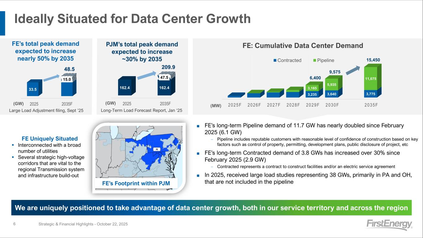 GAAP EPS Core EPS Investments ($B) $0.73 $0.76 $1.2 $0.76 $0.83 $1.6 GAAP EPS Core EPS Investments ($B) $1.25 $1.76 $3.1 $1.85 $2.02 $4.0 Financial Overview 5 Financial Results (1) Basic Earnings Per Share Attributable to FE Corp. (2) See slides 21-28 for reconciliations between GAAP and Core EPS (Non-GAAP). Please see slide 3 for more information. (1) We are committed to achieving our goals and realizing our bright future as a premier electric company (2) 3rd Quarter September YTD 2025 (1) (2) 2024 Strategic & Financial Highlights - October 22, 2025 Highlights 3Q25 Core EPS of $0.83/sh vs. 3Q24 of $0.76/sh, 9% growth reflects customer-focused formula-rate investments and new PA rates Declared dividend of $0.445/sh in September (payable 12/1/25), consistent with guidance and represents ~5% growth vs. 2024 YTD25 Investments of $4.0B, ~30% higher than YTD24; Increasing 2025F to $5.5B (from $5.0B) and vs. 2024 of $4.5B YTD25 Core EPS of $2.02/sh vs. YTD24 of $1.76/sh, 15% growth reflects continued strong execution and financial discipline Raising 2025 Core EPS Guidance midpoint and narrowing range to $2.50-$2.56/sh (from $2.40-$2.60/sh) and vs. 2024 of $2.37/sh