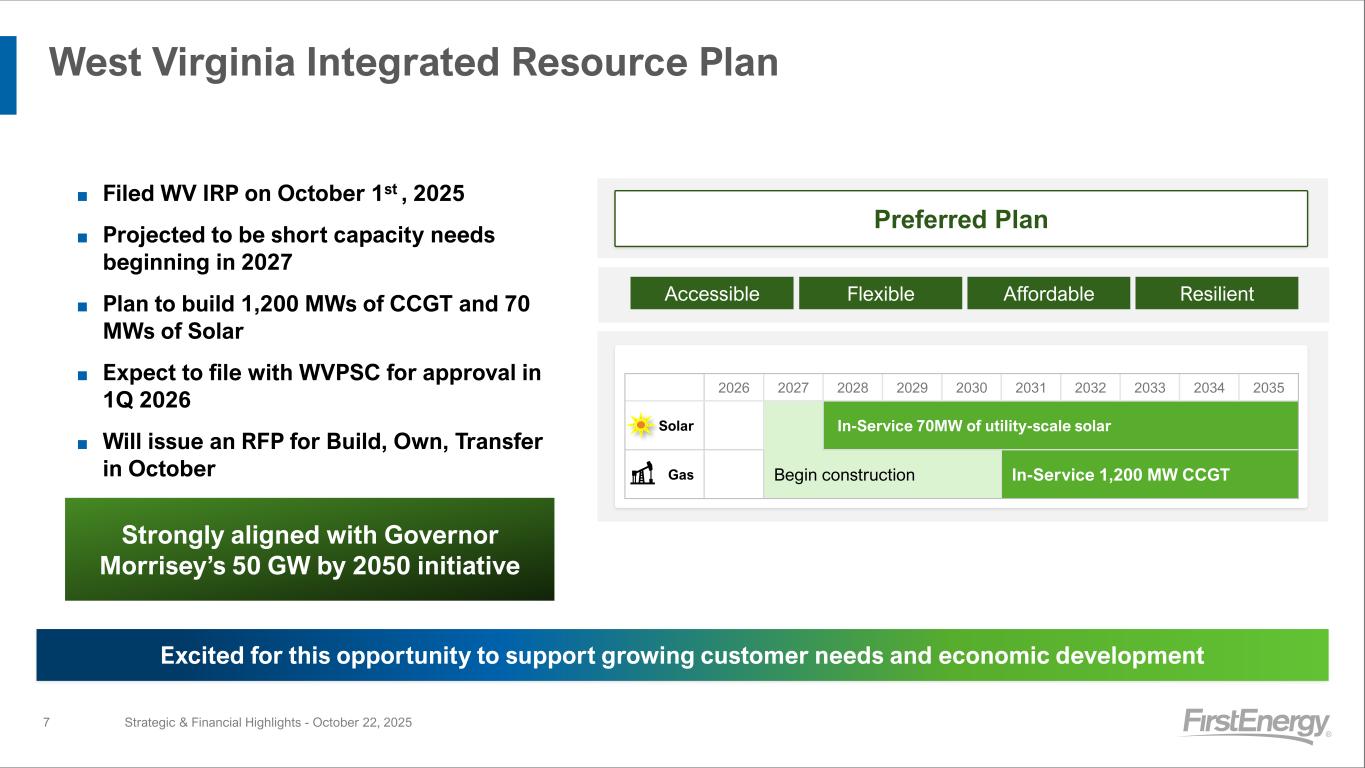Ideally Situated for Data Center Growth 2 0 2 5 F 2 0 2 6 F 2 0 2 7 F 2 0 2 8 F 2 0 2 9 F 2 0 3 0 F 2 0 3 5 F 3,235 3,640 3,775 3,165 5,935 11,675 Contracted Pipeline 15,450 9,575 6,400 FE: Cumulative Data Center Demand We are uniquely positioned to take advantage of data center growth, both in our service territory and across the region (GW) (MW)2025 2035F 33.5 15.0 FE’s total peak demand expected to increase nearly 50% by 2035 (GW) 48.5 209.9 FE’s Footprint within PJM ■ FE’s long-term Pipeline demand of 11.7 GW has nearly doubled since February 2025 (6.1 GW) – Pipeline includes reputable customers with reasonable level of confidence of construction based on key factors such as control of property, permitting, development plans, public disclosure of project, etc ■ FE’s long-term Contracted demand of 3.8 GWs has increased over 30% since February 2025 (2.9 GW) – Contracted represents a contract to construct facilities and/or an electric service agreement ■ In 2025, received large load studies representing 38 GWs, primarily in PA and OH, that are not included in the pipeline Strategic & Financial Highlights - October 22, 20256 Long-Term Load Forecast Report, Jan ‘25Large Load Adjustment filing, Sept ’25 PJM’s total peak demand expected to increase ~30% by 2035 FE Uniquely Situated ▪ Interconnected with a broad number of utilities ▪ Several strategic high-voltage corridors that are vital to the regional Transmission system and infrastructure build-out 2025 2035F 162.4 162.4 47.5