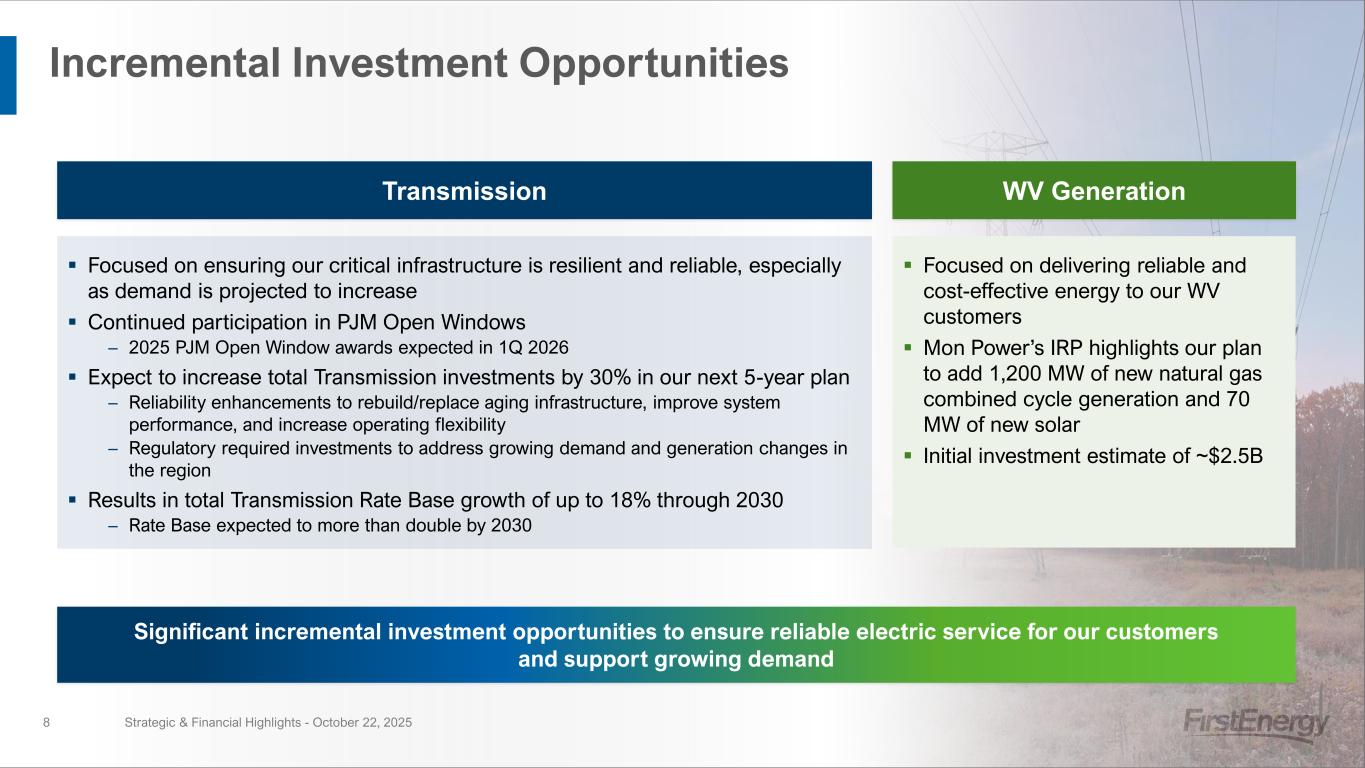 Strategic & Financial Highlights - October 22, 2025 West Virginia Integrated Resource Plan 7 2026 2027 2028 2029 2030 2031 2032 2033 2034 2035 Solar In-Service 70MW of utility-scale solar Gas Begin construction In-Service 1,200 MW CCGT Accessible ResilientFlexible Affordable Preferred Plan Strongly aligned with Governor Morrisey’s 50 GW by 2050 initiative Excited for this opportunity to support growing customer needs and economic development ■ Filed WV IRP on October 1st , 2025 ■ Projected to be short capacity needs beginning in 2027 ■ Plan to build 1,200 MWs of CCGT and 70 MWs of Solar ■ Expect to file with WVPSC for approval in 1Q 2026 ■ Will issue an RFP for Build, Own, Transfer in October