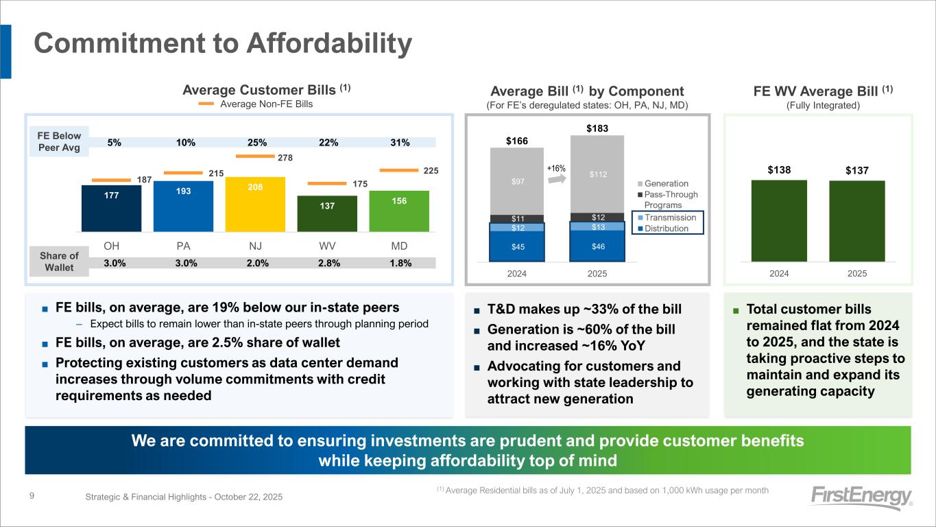 Incremental Investment Opportunities Strategic & Financial Highlights - October 22, 20258 Transmission WV Generation ▪ Focused on delivering reliable and cost-effective energy to our WV customers ▪ Mon Power’s IRP highlights our plan to add 1,200 MW of new natural gas combined cycle generation and 70 MW of new solar ▪ Initial investment estimate of ~$2.5B Significant incremental investment opportunities to ensure reliable electric service for our customers and support growing demand ▪ Focused on ensuring our critical infrastructure is resilient and reliable, especially as demand is projected to increase ▪ Continued participation in PJM Open Windows – 2025 PJM Open Window awards expected in 1Q 2026 ▪ Expect to increase total Transmission investments by 30% in our next 5-year plan – Reliability enhancements to rebuild/replace aging infrastructure, improve system performance, and increase operating flexibility – Regulatory required investments to address growing demand and generation changes in the region ▪ Results in total Transmission Rate Base growth of up to 18% through 2030 – Rate Base expected to more than double by 2030