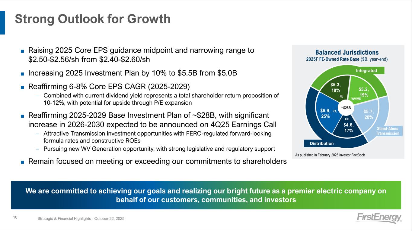 $45 $46 $12 $13 $11 $12 $97 $112 2024 2025 Average Customer Bills (1) Average Non-FE Bills Commitment to Affordability Strategic & Financial Highlights - October 22, 20259 ■ FE bills, on average, are 19% below our in-state peers – Expect bills to remain lower than in-state peers through planning period ■ FE bills, on average, are 2.5% share of wallet ■ Protecting existing customers as data center demand increases through volume commitments with credit requirements as needed 177 193 208 137 156 187 215 278 175 225 OH PA NJ WV MD Share of Wallet 3.0% 3.0% 2.0% 2.8% 1.8% We are committed to ensuring investments are prudent and provide customer benefits while keeping affordability top of mind ■ T&D makes up ~33% of the bill ■ Generation is ~60% of the bill and increased ~16% YoY ■ Advocating for customers and working with state leadership to attract new generation +16% $166 $183 FE Below Peer Avg 5% 10% 25% 22% 31% (1) Average Residential bills as of July 1, 2025 and based on 1,000 kWh usage per month Average Bill (1) by Component (For FE’s deregulated states: OH, PA, NJ, MD) ■ Total customer bills remained flat from 2024 to 2025, and the state is taking proactive steps to maintain and expand its generating capacity FE WV Average Bill (1) (Fully Integrated) $138 $137 2024 2025