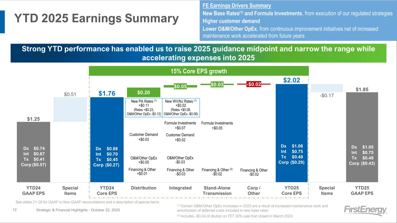11 3Q 2025 Earnings Summary $0.03 $0.73 $0.76 $0.03 -$0.04 $0.08 $0.00 3Q24 GAAP EPS Special Items 3Q24 Core EPS Distribution Integrated Stand-Alone Transmission Corp / Other $0.83 -$0.07 $0.76 3Q25 Core EPS Special Items 3Q25 GAAP EPS Dx $0.34 Int $0.34 Tx $0.12 Corp ($0.07) Formula Investments +$0.03 Dx $0.38 Int $0.35 Tx $0.13 Corp ($0.10) Dx $0.41 Int $0.31 Tx $0.21 Corp ($0.10) Customer Demand +$0.01 O&M/Other OpEx -$0.01 Formula Investments +$0.03 Customer Demand -$0.01 O&M/Other OpEx -$0.02 Dx $0.40 Int $0.32 Tx $0.21 Corp ($0.17) FE Earnings Drivers Summary New PA Rates(1), higher base revenues partially offset by higher approved expenses Formula Investments, in Integrated and Stand-Alone Transmission segments Higher O&M, primarily from increased maintenance work accelerated from future years Strong 3rd Quarter performance (1) Certain O&M/Other OpEx increases in 2025 are a result of increased maintenance work and amortization of deferred costs included in new base rates 9% Core EPS growth Financing & Other +$0.05 Financing & Other -$0.04 Strategic & Financial Highlights - October 22, 2025 See slides 21-28 for GAAP to Non-GAAP reconciliations and a description of special items New PA Rates (1) +$0.03 (Rates +$0.08, O&M/Other OpEx -$0.05)